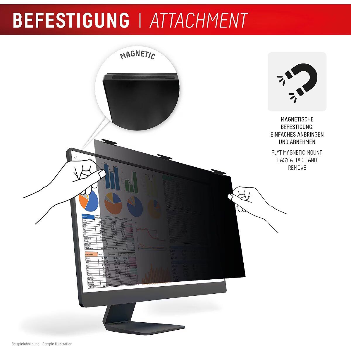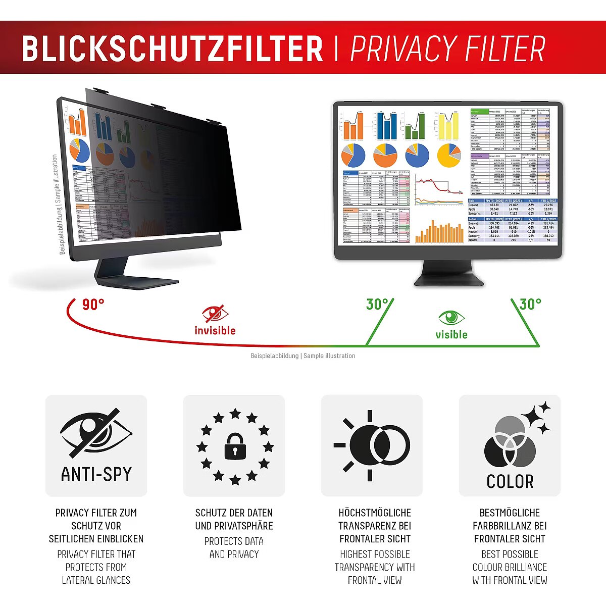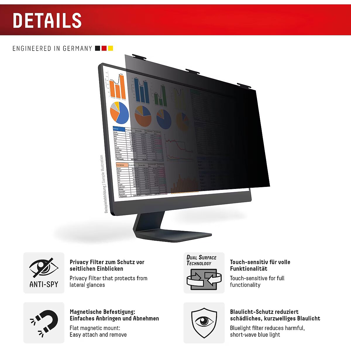 LongDesc - Highly effective 2-way privacy filter protects the screen from scratches and damage and limits the field of view to+/- 30°. I.e. from an angle of approx. 30° the display appears black, so that your privacy and sensitive data are protected from unwanted side views, compliance with the General Data Protection Regulation (GDPR) is supported.Thanks to the magnetic attachment, the Privacy Safe privacy filter can be attached and removed quickly and easily. The neodymium magnets are 100% tested and safe to use on monitors. Dual Surface Technology: the Privacy Safe privacy filter has 2 different turnable sides. The matt anti-reflective surface allows non-reflective, glare-free use (especially in bright light) and reduces annoying fingerprints. The other, glossy side provides a clearer view of the screen and maximum colour brilliance, especially indoors and in medium to dark light conditions.The integrated bluelight filter reduces harmful short-wave blue light, providing eye relief and reducing the likelihood of blue light-related eye irritation and sleep disturbance.