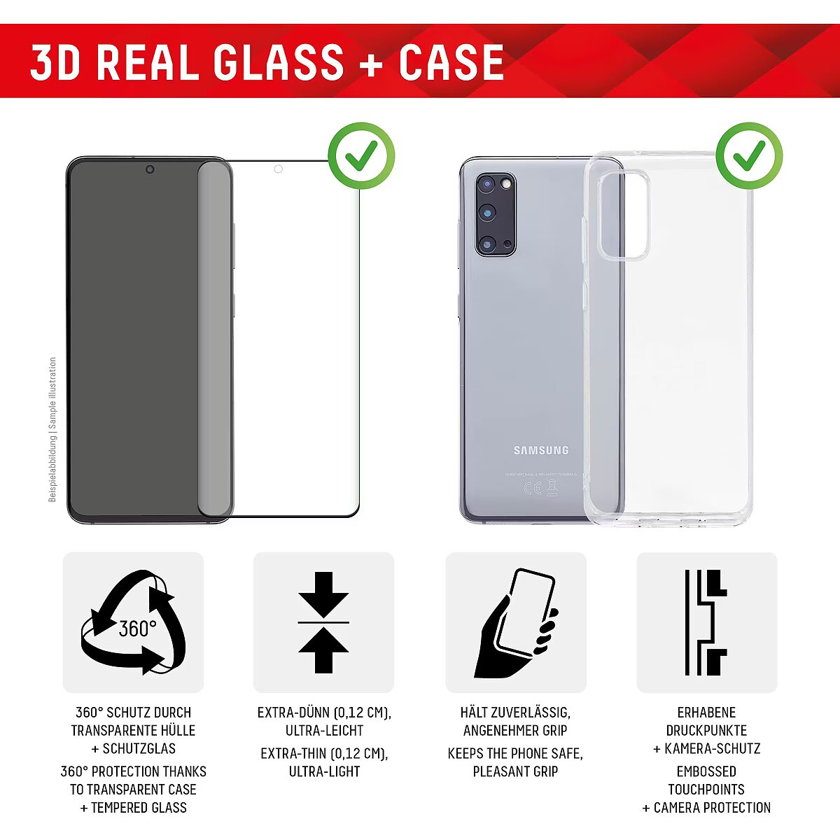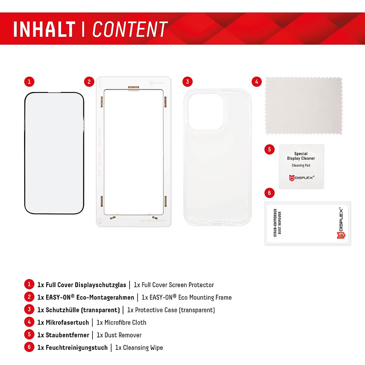 LongDesc - Real Glass (2D) with Case, 360°-Protection with EASY-ON® Eco Mounting Frame Protective case for 360°-protectionOur Displex protective glass is manufactured to within 5/100 mm of the smartphone contours and therefore fits perfectly on your smartphone. In addition, the protective film is ultra-thin at 3mm. This means that the transparent case, that is included in this product, can be used perfectly with the screen protection glass. But also all other standard-sized protective cases can be used with the screen protector. Thus, your smartphone is optimally protected all around by a combined protection of the Displex Tempered Glass and your favourite case. Tempered glass with rounded edgesAll Displex protective glasses have a surface hardness of 10H and are therefore not only more scratch-, break- and shock-resistant than comparable brand products, but even surpass sapphire glass, which is used in luxury watches and has a hardness of 9H.Even the edges, the area of the smartphone and protective glass most susceptible to breakage and impact, are specially hardened, rounded by 4-fold polishing and finished with a shock-absorbing edge. This elaborate production process further increases the protection against knocks and bumps and allows a particularly pleasant use of the smartphone. With these features, the protective glass is extremely resistant and guarantees maximum breakage resistance. Case-friendlyOur Displex protective glass is manufactured to within 5/100 mm of the smartphone contours and therefore fits perfectly on your smartphone. In addition, the protective film is ultra-thin at 3mm. This means that all standard-sized protective cases can be used with the screen protection glass. Thus, your smartphone is optimally protected all around by a combined protection of the Displex Tempered Glass and your favourite case. Anti fingerprint coatingThe top layer of our 4-Layer Technology is a high-tech plasma coating. With an extremely long-lasting effect, this coating effectively repels fingerprints. In addition, the plasma coating guarantees a soft scrolling experience. This technology not only makes your display look better, but it also keeps it cleaner and therefore requires less frequent cleaning. High-tech splinter protectionThe high-tech shatter protection integrated in the Real Glass from Displex guarantees absolute safety even if the protective glass breaks. Thanks to the composite material of the second layer in the protective glass, it does not shatter and thus guarantees absolutely safe use. If the worst should come to the worst and the protective glass has absorbed a blow, fall or impact and is broken, the Displex protective glass can be easily pulled off the display in one piece thanks to the integrated high-tech shatter protection. High-performance adhesiveOnce the protective glass has been fitted, the high-performance adhesive ensures optimum adhesion properties and a clear look. The adhesive is adapted to all display coatings of the various manufacturers so that the protective film for mobile phones holds reliably in the long term. The visual appearance is not affected either: despite the screen protection film, you can enjoy gripping videos and photos with maximum transparency and colour fidelity. Simple & bubble-free applicationWith the EASY-ON® Eco Mounting Frame and the accompanying video tutorials, mounting the tempered glass is incredibly quick, easy and precise. In addition the EASY-ON® Eco Mounting Frame is made of premium solid cardboard and is therefore not only sustainable, but also a 100% recyclable. The result is worth seeing: no crooked positioning of the screen protector on the display, no concealed openings for speakers or microphones and certainly no bubbles under the protective glass.