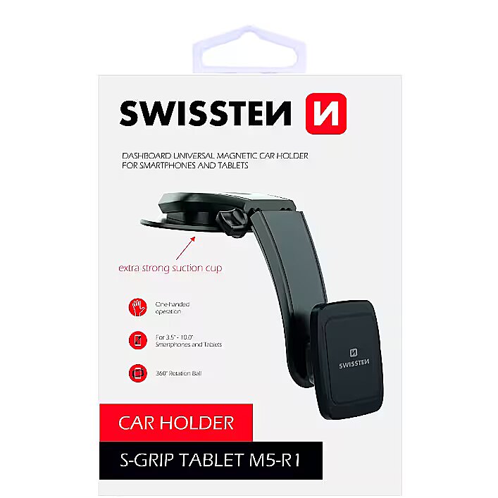 description_en - Gravity car holder S-GRIP M5-R1 is designed for mounting on the dashboard. Thanks to magnetic fixing it can be operated with one hand. SWISSTEN blister pack.