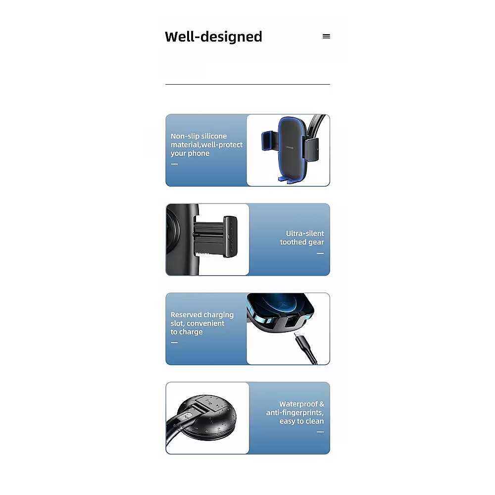 Other features - Material: ABS+Silicone Suitable for: 4.7-7.2 inch mobile phones Clamp range: 52-95mm Applicable position: dashboard, windshield