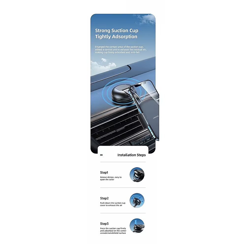 Description - It is made of ABS and silicone material, which is solid and durable Suitable for most mobile phones with a width of 52-95mm and size within 4.7-7.2 inch It can rotate 360 degrees, convenient to adjust viewing angles Waterfall streamline design, hold your phone firmly Telescopic clamping arm + gear locking, with stable suction cup Non-slip silicone contact surface, protect your phone The suction cup phone bracket can be installed on the dashboard or windshield Specification: Material: ABS+Silicone Suitable for: 4.7-7.2 inch mobile phones Clamp range: 52-95mm Applicable position: dashboard, windshield
