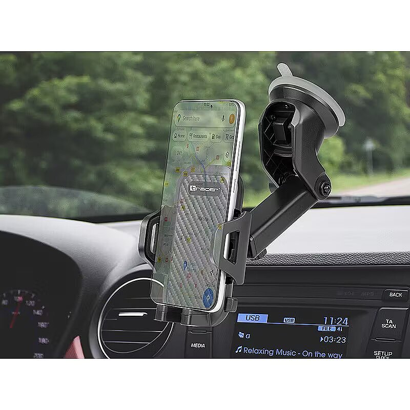 Uchwyt samochodowy Tracer przeznaczony jest do przymocowania do przedniej szyby lub kokpitu. Mocna przyssawka z silikonem zapewnia łatwy i szybki montaż, zdejmowanie uchwytu oraz regulację jego położenia.