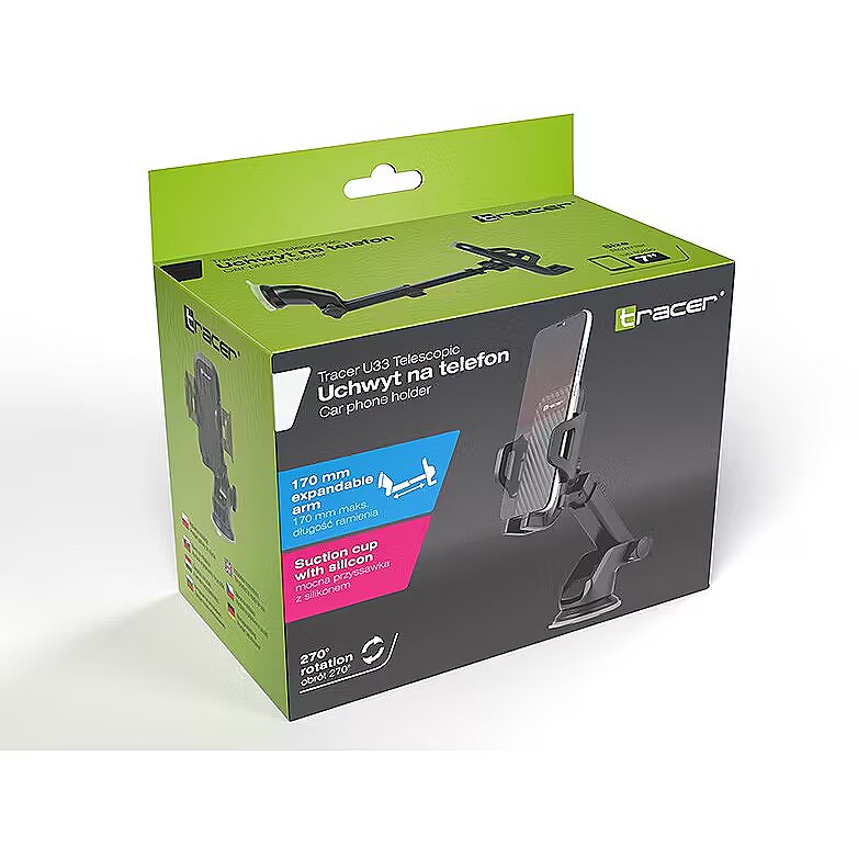 Uchwyt samochodowy Tracer to niezbędne akcesorium każdego kierowcy. Szybkie i mocne mocowanie do szyby lub kokpitu zapewnia stabilność telefonu podczas jazdy, co jest szczególnie ważne, gdy smartfon pełni funkcję nawigacji. Uchwyt Tracer pozwala bezpiecznie korzystać z telefonu podczas jazdy. Urządzenie gwarantuje maksymalną ochronę telefonu i zapewnia komfort kierowcy podczas podróży. Przeznaczony do smartfonów o przekątnej do 7" Mocowanie przyssawką do szyby lub kokpitu Wysuwane ramię 170 mm Obrotowy 270 stopni Wytrzymały materiał Stabilny chwyt Doskonałe dopasowanie