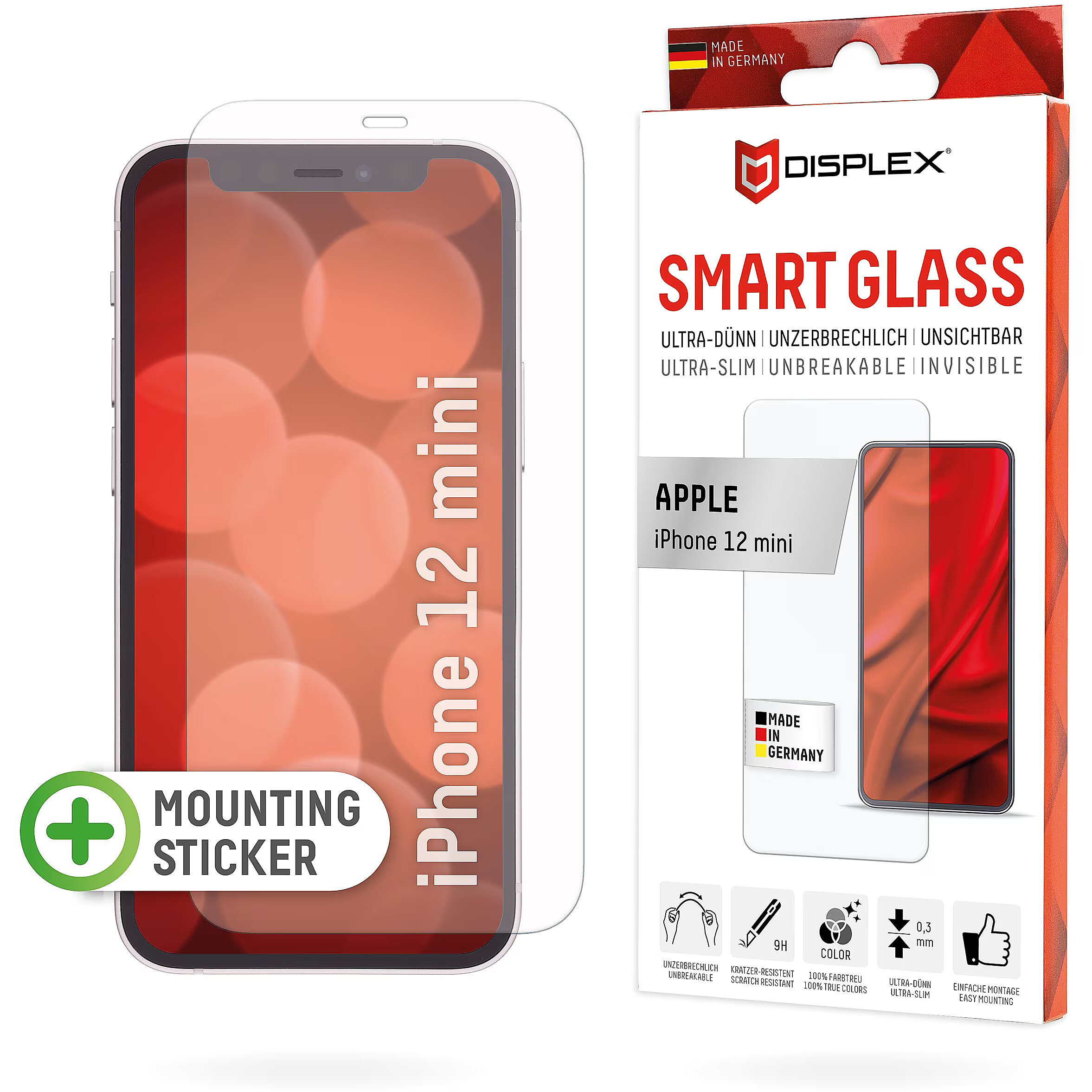 LongSummaryDescription - Displex Smart Glass (9H) for Apple iPhone 12 mini, Mounting Sticker, unbreakable, ultra-slim, invisible. Brand compatibility: Apple, Compatibility: iPhone 12 mini. Dry application. Protection features: Impact resistant, Scratch resistant, Dust resistant. Material: Tempered glass, Product colour: Transparent. Quantity per pack: 1 pc(s)