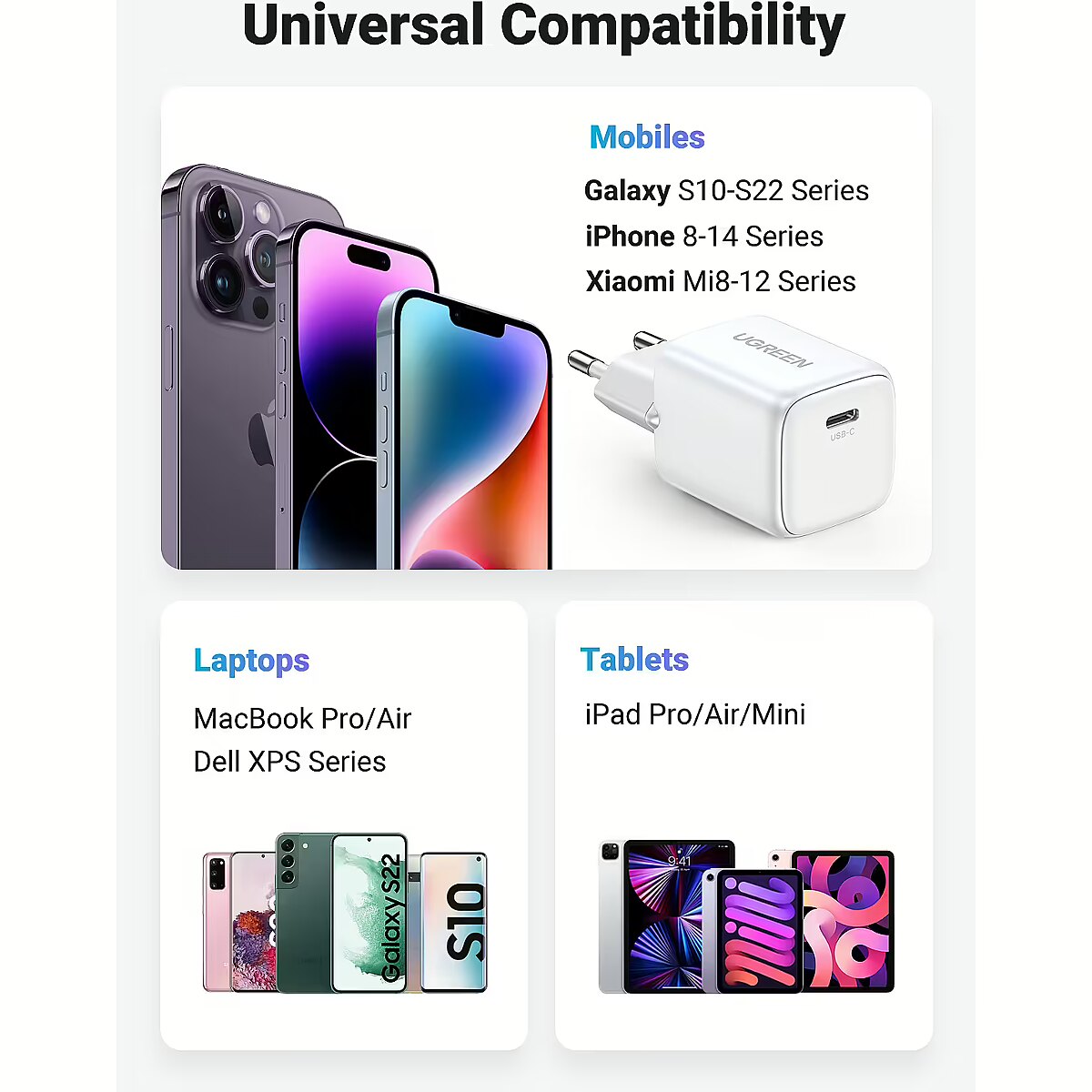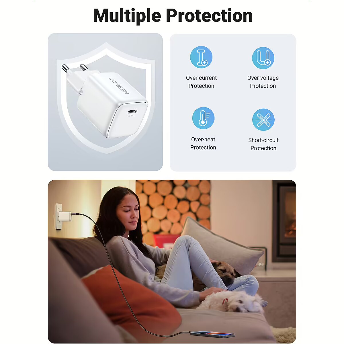 LongSummaryDescription - Ugreen 15324. Charger type: Indoor, Power source type: AC, Charger compatibility: Universal, USB Type-C ports quantity: 1, Power protection features: Over current, Over voltage, Overheating, Short circuit. Product colour: White