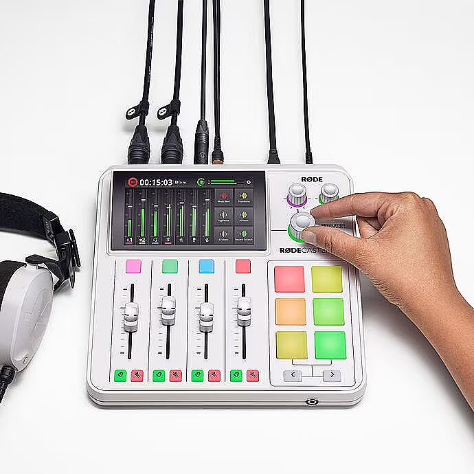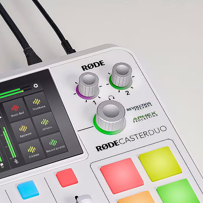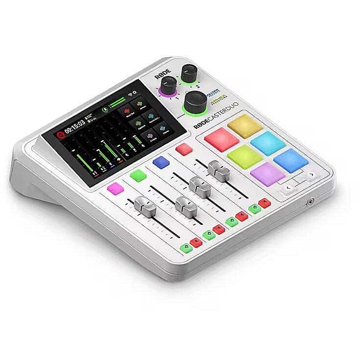 description_en - The RØDECaster Duo is a compact and incredibly powerful all-in-one audio production solution for podcasters and content creators. It features two high-quality Neutrik® combo inputs for connecting microphones, instruments or line-level devices, a 3.5mm TRRS headset input, and integrated wireless receiver for connecting RØDE wireless microphones, making it incredibly versatile. Ultra-low-noise, high-gain Revolution Preamps™ and studio-grade APHEX® audio processing delivers pristine audio quality, with dual USB-C interfaces for connecting two computers or mobile devices and Bluetooth connectivity for seamless phone call integration. The RØDECaster Duo is fully customisable, with seven individually assignable channels and six programmable SMART pads for on-the-fly triggering of sound or voice FX and other actions. Fully integrated audio production studio for podcasters and content creators Ultra-low-noise, high-gain Revolution Preamps™ (-131.5dBV EIN, 76dB gain) Two high-quality Neutrik® combo inputs for connecting microphones, instruments or line-level devices Seven individually assignable channels with four broadcast-quality physical faders and three virtual faders Integrated wireless receiver for connecting RØDE Series IV wireless devices (including the Wireless GO II and Wireless ME) High-performance quad-core audio engine Studio-grade APHEX® audio processing and on-board effects Six fully programmable SMART pads with bank switching 3.5mm TRRS input for connecting headphones and headsets Dual USB-C interfaces for connecting two computers or mobile devices Advanced Bluetooth® connectivity for high-quality phone call integration Designed and made in RØDE’s state-of-the-art facilities in Sydney, Australia