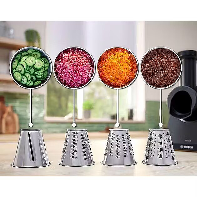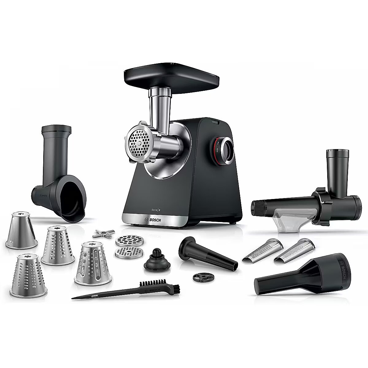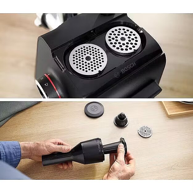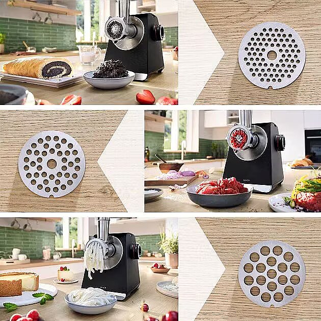 Accessories included - Lejek Popychacz Przystawka do robienia kiełbasy Wyciskarka do owoców jagodowych i pomidorów Szatkownica z 4 bębnami Sita ze stali nierdzewnej w trzech rozmiarach (3 mm, 4,5 mm i 8 mm) Dwustronny nożyk Nasadka do kebbe Szczoteczka do czyszczenia metalowych