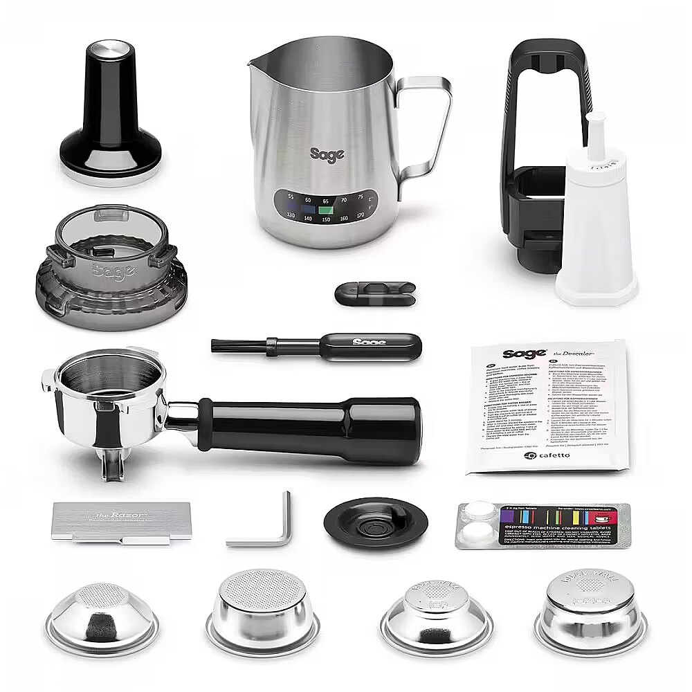 Accessories included - Dosing Funnel Przyrząd do porcjowania kawy Razor Kolba ze stali nierdzewnej o średnicy 54 mm Sitka filtrujące o pojedynczym i podwójnym dnie do parzenia 1 albo 2 filiżanek Miarka do kawy Wbudowany ubijak Dzbanek na mleko ze stali nierdzewnej Dysk i tabletki czyszczące Szczotka do czyszczenia, przyrząd do czyszczenia i klucz imbusowy Uchwyt filtra wody i filtr wody