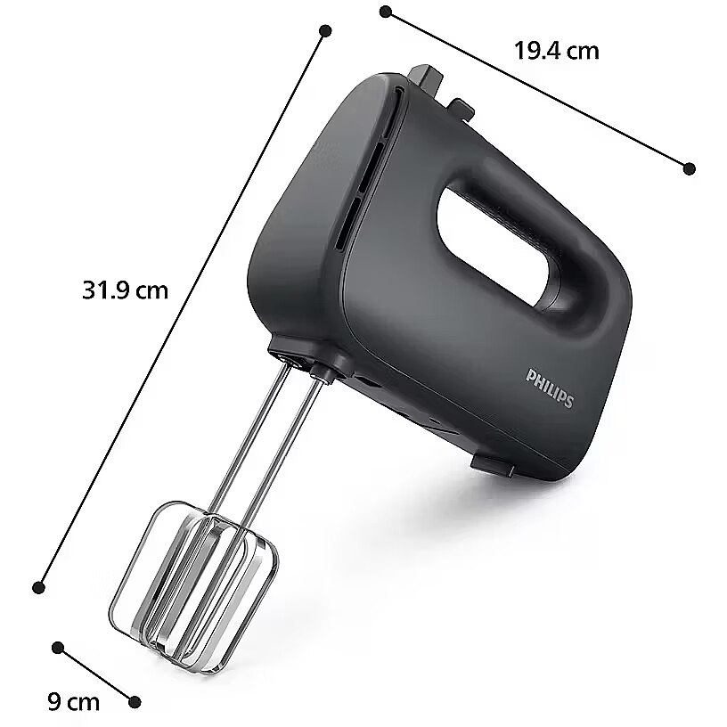LongSummaryDescription - Philips HR3739/00. Type: Hand mixer, Mixer functions: Beat, Mixing, Whisking, Cord length: 1.2 m. Housing material: Plastic. Power: 400 W, AC input voltage: 230 V, AC input frequency: 50 Hz. Width: 194 mm, Depth: 90 mm, Height: 319 mm. Package width: 212 mm, Package depth: 110 mm, Package height: 209 mm