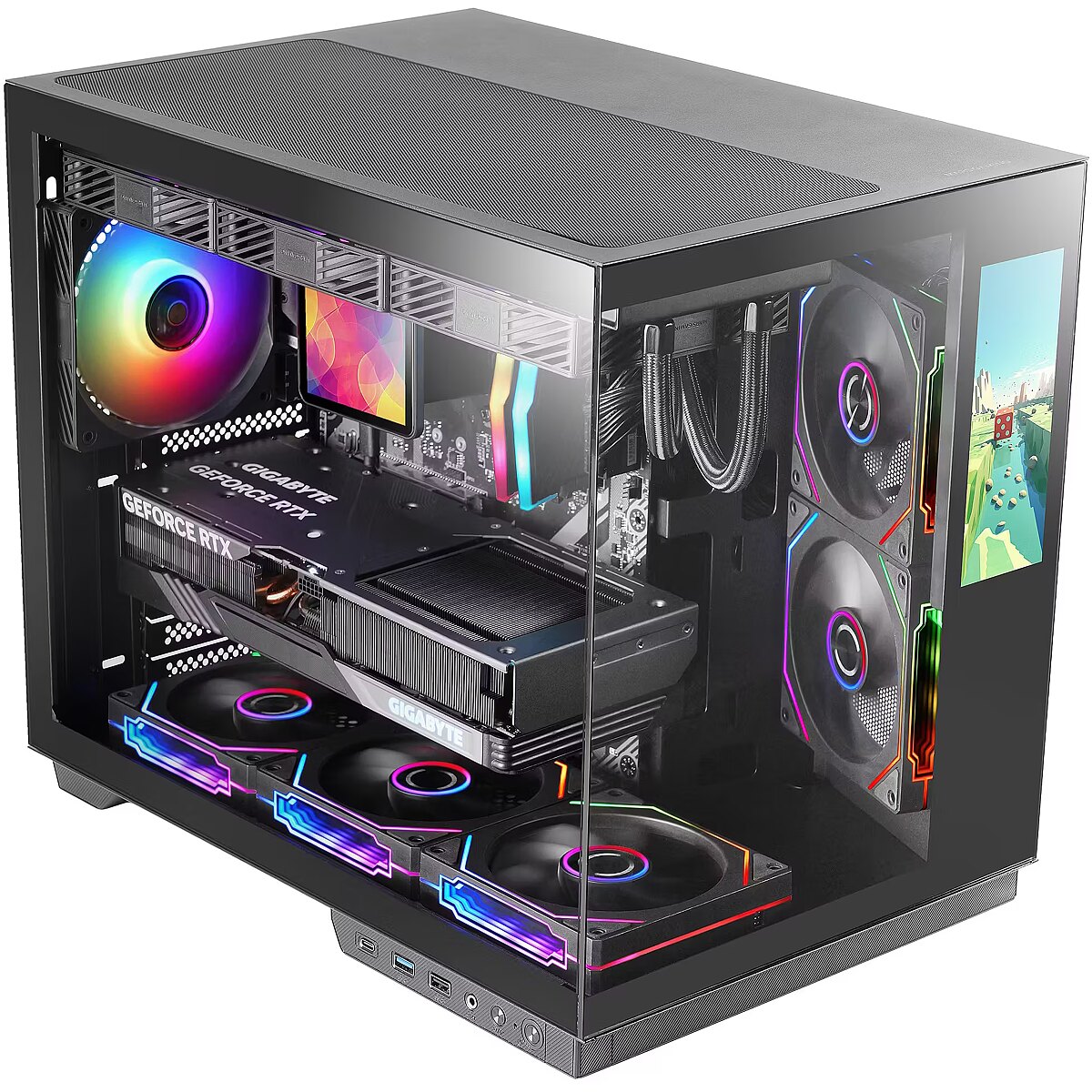 LongDesc - GAMING CASE MC-MIRAGEDiscover the MC-MIRAGE, an ATX gaming case that takes customization and performance to a new level thanks to its exclusive integrated 7.2” IPS LCD screen and its elegant panoramic tempered glass design. With a dual-chamber structure, advanced compatibility, and space for next-generation hardware, it is built for enthusiasts, gamers, and creators who want a unique, sophisticated setup packed with innovation.Visual innovation and limitless power- Customizable 7.2” IPS LCD screen- Continuous tempered glass front and side panel- Dual-chamber structure- Support for liquid cooling up to 360 mmINTEGRATED LCD SCREENThe MC-MIRAGE features a 7.2” IPS LCD screen with 360×960 px resolution, allowing you to monitor performance in real time and add an unmatched level of customization. Thanks to its control software, you can display system data, images, animations, or even videos, turning your case into an interactive showcase that combines style and functionality.PANORAMIC AESTHETICSThe continuous tempered glass front and side panels provide a clear, immersive view of the interior. This panoramic design highlights every component and enhances ARGB lighting effects, creating a visual spectacle that blends elegance, creativity, and personality.DUAL-CHAMBER STRUCTUREIts optimized dual-chamber structure separates the power supply and storage from the rest of the components. This layout improves airflow, simplifies assembly, and keeps cables hidden, ensuring a flawless aesthetic and superior thermal performance.VERSATILITY AND COMPATIBILITYThe MC-MIRAGE offers advanced support for ATX, MicroATX, and Mini-ITX motherboards. With space for graphics cards up to 400 mm and CPU coolers up to 165 mm, it is ready for next-gen hardware. Its advanced cable management ensures a clean installation, boosting both cooling efficiency and the final visual impact.Note: Compatible with reverse connector ATX and MicroATX motherboards.ADVANCED COOLINGDesigned for extreme setups, it supports up to 9 fans and liquid cooling systems up to 360 mm (maximum dimensions: 395×120×52 mm). Its internal layout promotes continuous airflow, keeping stable temperatures even under heavy loads, ensuring long-lasting, consistent performance.NEXT-GEN CONNECTIVITYEquipped with a next-generation front panel, the MC-MIRAGE includes USB 3.0, USB-C, and HD Audio + Mic, providing instant access to peripherals and external devices.