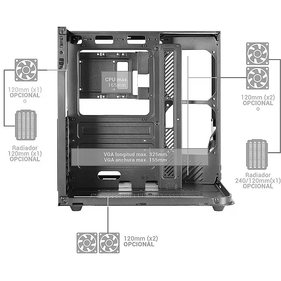 LongDesc - The MC INFINIOLITE brings Mars Gaming's "infinity" design to a more accessible form factor, maintaining the premium aesthetics and dual-chamber structure of the INFINIOLITE model, but leaving you total freedom to choose your own cooling. Its frameless continuous curved tempered glass, combined with the glass top panel, offers a spectacular panoramic view of the interior, ideal for gaming or content creation setups looking to excel in both performance and image.Tempered glass infinity designThe MC INFINIOLITE features a wrap-around design of curved tempered glass that joins front and side in a single frameless piece, creating a continuous effect that turns your hardware into the real protagonist. This glass is accompanied by a tempered glass top panel, so that the interior is visible from almost any angle. The result is a clean and panoramic view, perfect to show off your motherboard, GPU and lighting system with a level of detail typical of high-end showcases.Double chamber structureThe interior is organized in a dual-chamber structure that separates the power supply and the bulk of the cabling into a hidden lower compartment. This arrangement leaves the main area completely clear for key components and improves airflow, avoiding unnecessary obstructions. Assembly becomes more convenient and tidy, and the final finish is much more professional, with fewer cables in sight and impeccable aesthetics.Ready for your cooling systemThe MC INFINIOLITE does not include fans as standard so you can design exactly the cooling system that best fits your mounting style. The chassis is ready to mount liquid cooling with radiators up to 240 mm in the compatible positions and supports up to five 120 mm fans distributed inside. You can configure a team focused on silence, go for high static pressure fans to squeeze your radiators or mount a spectacular ARGB set: the case is ready to adapt to your ideal configuration.Space for high-performance hardwareAlthough it prioritizes aesthetics within the ATX form factor, the MC INFINIOLITE offers plenty of space for mounting high-performance configurations. It is compatible with CPU coolers up to 165 mm in height, allowing advanced air solutions to be installed, and supports graphics cards up to 325 mm in length, making it perfect for both next-generation gaming builds and workstations oriented to video editing, 3D or streaming.Advanced front-end connectivityThe front panel integrates everything you need for your day-to-day life without having to access the back of the device. There's a USB-C port for next-generation peripherals and storage, a high-speed USB 3.0 port, an additional USB 2.0 port and HD audio connectors for headphones and microphone. Everything is conveniently positioned and accessible to make connecting and disconnecting devices quick and easy.