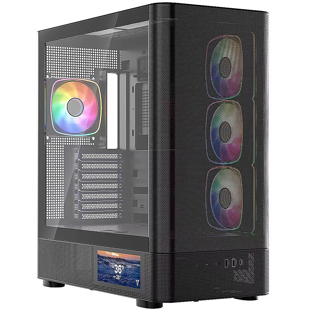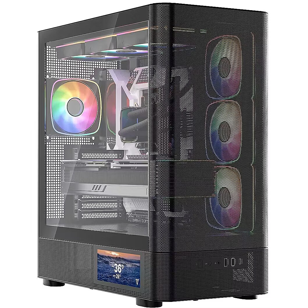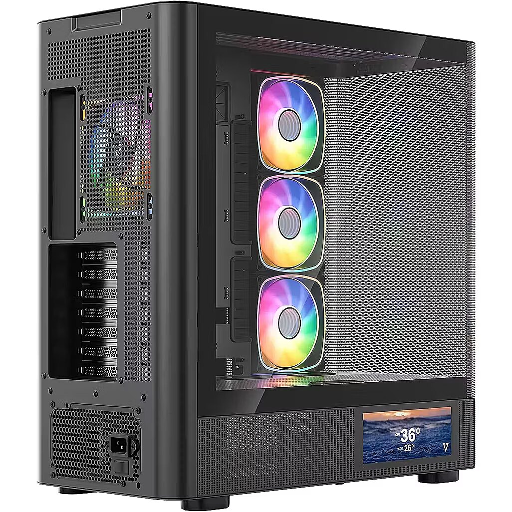 Description - PC case Volcano AQ400 ARGB MIDI BLACK The MODECOM Volcano AQ400 ARGB MIDI is a representative of the Volcano AQ case series, characterized by an eye-catching design with rounded shapes of the front panel (in this case, a perforated metal panel), support for installing motherboards with reversed connectors, four 120 mm ARGB fans included as standard with an ARGB lighting controller, and support for water-cooling radiators up to 420 mm, as well as numerous perforations on the side panels to ensure efficient cooling performance. A distinctive feature of the AQ400 version is the LCD screen located on the side of the case, which allows users to display images, play videos in MP4 format, or monitor temperatures and workload of the processor, graphics card, and RAM usage.All these features are complemented by two USB 3.0 ports and one USB-C port (USB 3.2 Gen 2). This is a case designed to showcase components and personalize the computer to your own style.