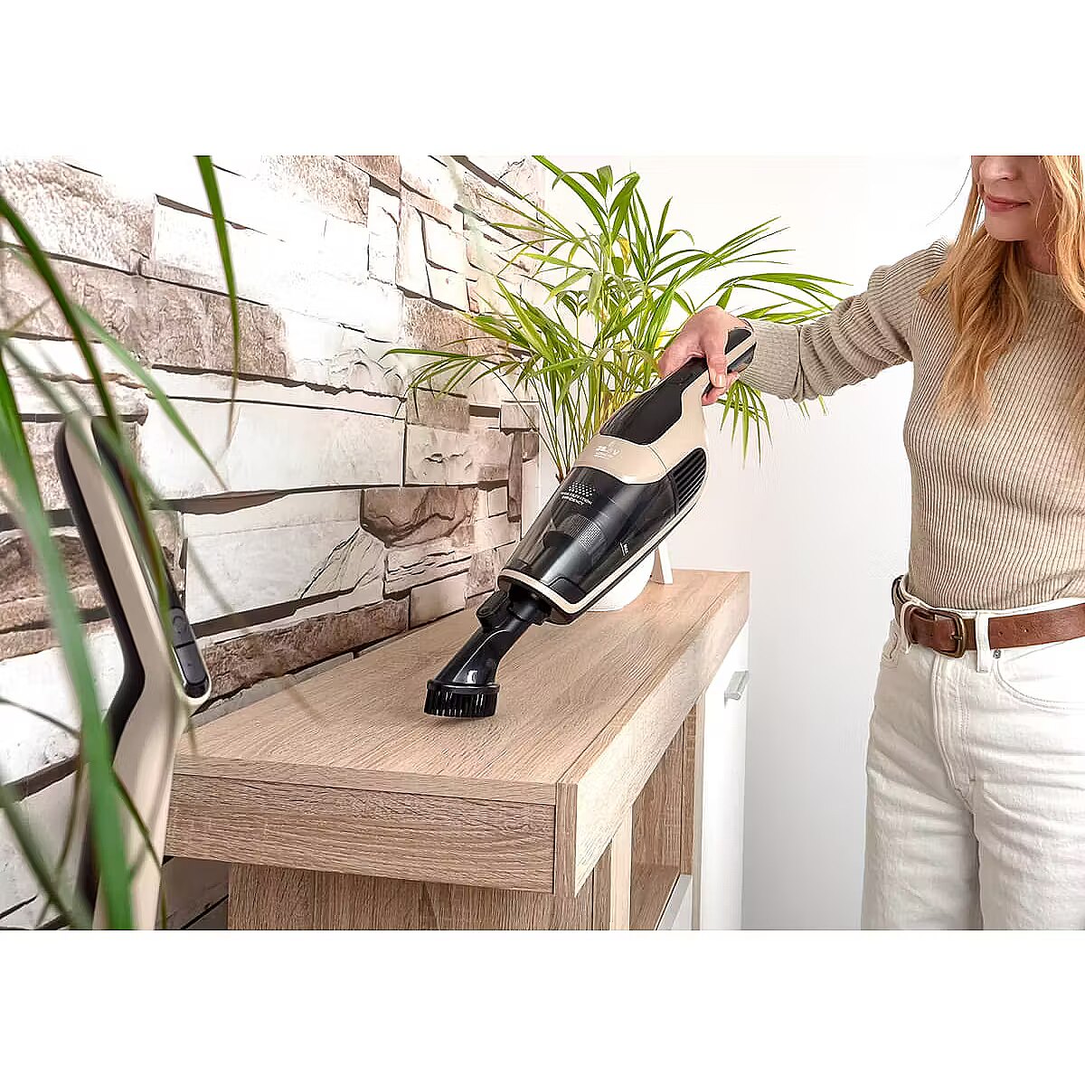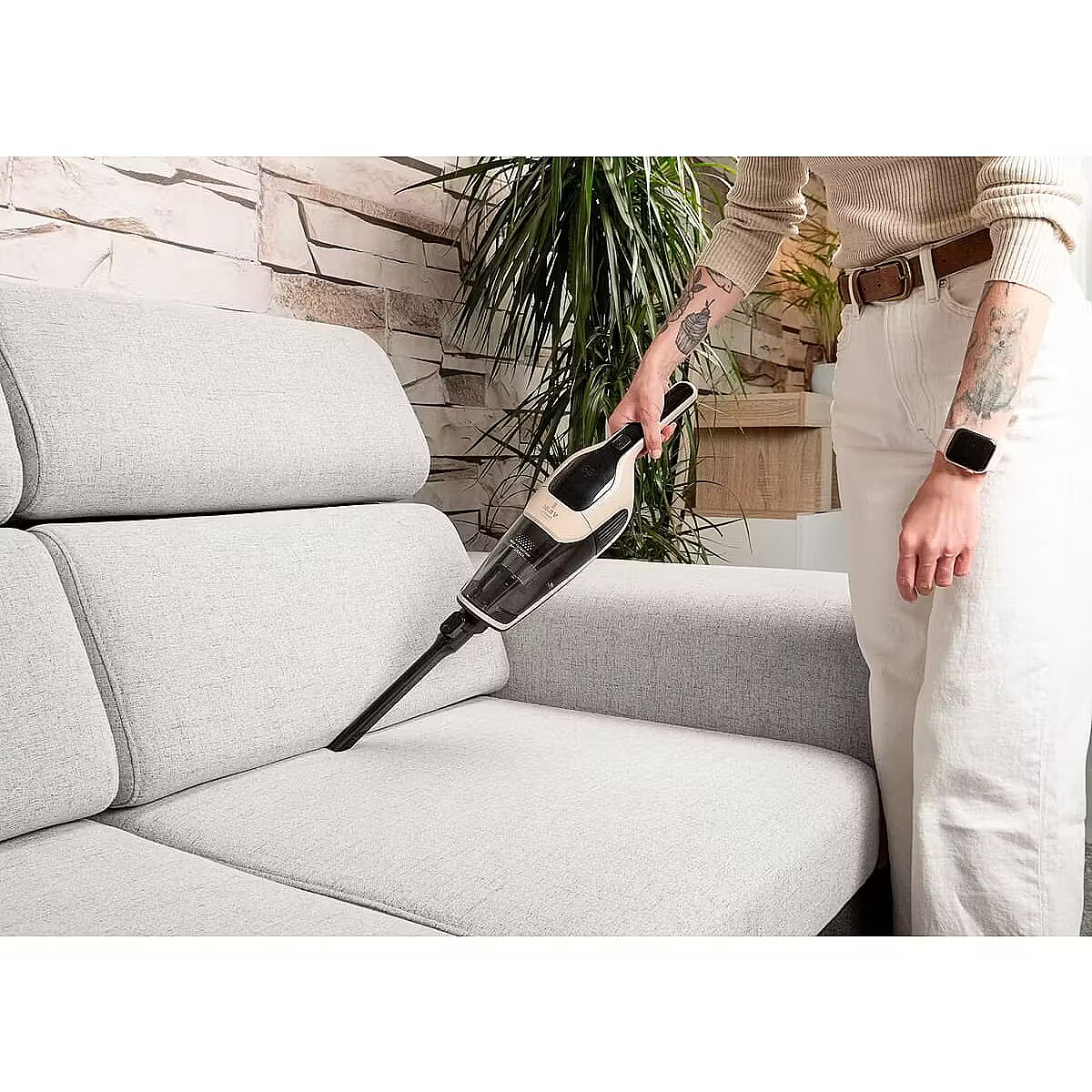 Odkurzacz pionowy został zaprojektowany z myślą o wygodzie, dlatego wyposażono go w składaną rączkę, która znacznie ułatwia przechowywanie nawet w mniejszych pomieszczeniach. Po sprzątaniu wystarczy złożyć urządzenie i odłożyć je np. do szafy lub za drzwi. W zestawie znajduje się także stacja ładująca, która zapewnia nie tylko wygodne ładowanie, ale również pełni rolę stabilnej podstawy do przechowywania odkurzacza wraz z akcesoriami.