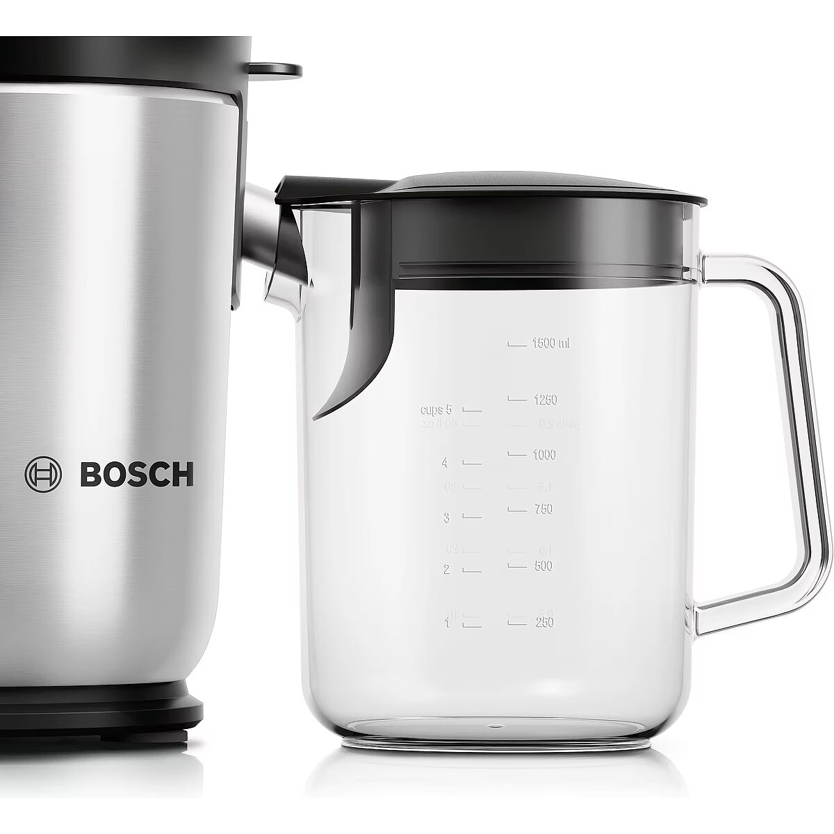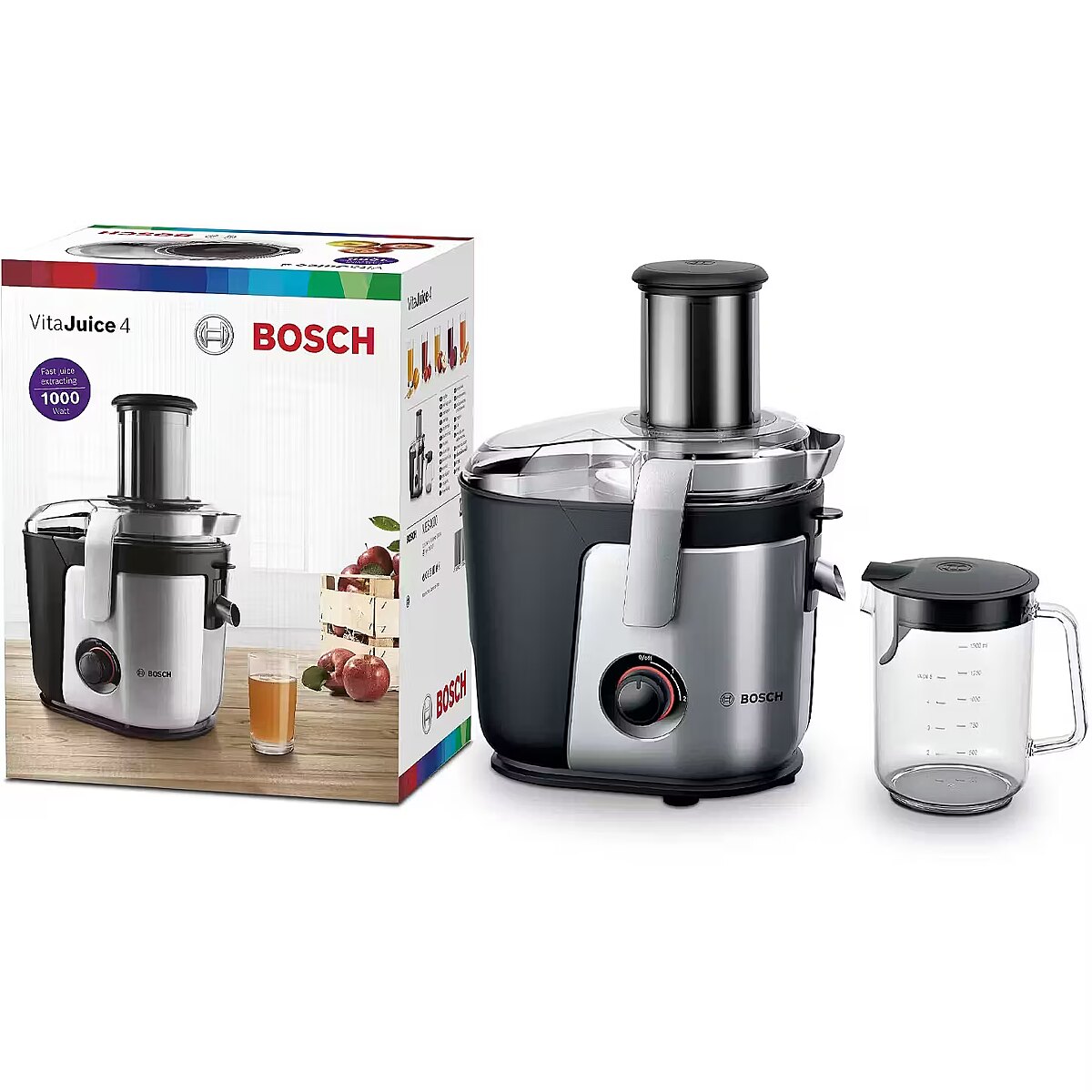 LongSummaryDescription - Bosch MES4000. Product type: Juice extractor, Product colour: Black, Grey, Stainless steel, Pulp container capacity: 3 L. Material: Aluminium. Power: 1000 W. Width: 425 mm, Depth: 322 mm, Height: 221 mm