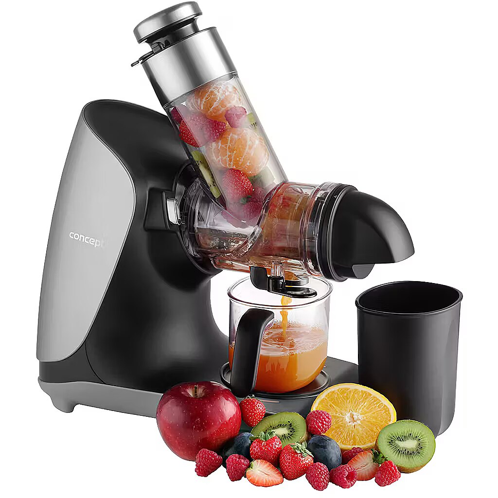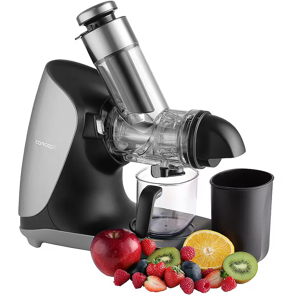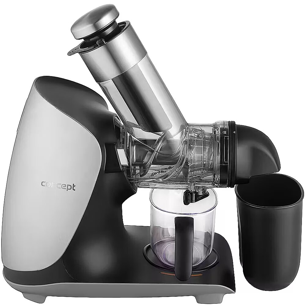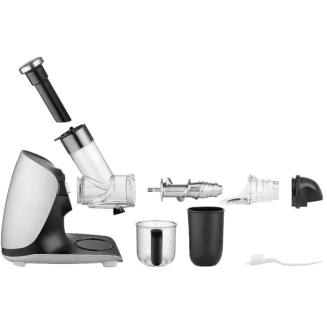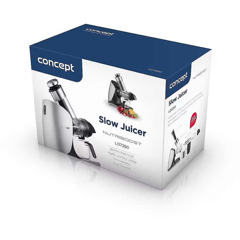 Description - 100% Juice Full of Vitamins and Nutrients If you enjoy a glass of freshly squeezed fruit or vegetable juice, the Concept LO7250 Nutriboost Slow Juicer is an excellent choice. Its slow juicing process, combined with a horizontal auger and high-quality stainless steel screw, ensures efficient processing of fruits, vegetables, and herbs with maximum yield and minimal waste. The low-speed system gently extracts juice, preserving valuable vitamins, enzymes, and the natural flavor of the ingredients. Advantages of the Stainless Steel Auger Equipped with a stainless steel auger, this juicer guarantees maximum efficiency and long-lasting durability. Its sturdy construction handles even tough ingredients such as carrots, beets, or apples, extracting the maximum amount of juice. Stainless steel also provides higher hygiene and easier cleaning, as it does not absorb odors or stains. Wide Feeding Chute for Whole Fruits With a 76 mm feeding chute, you can insert larger pieces of fruits and vegetables or even whole fruits. This reduces preparation time, as you dont need to cut ingredients into small pieces, saving both time and effort. Easy and Quick Cleaning with a Single Micro-Filter Cleaning the filter basket is often time-consuming, but the LO7250 solves this problem with a single universal micro-filter, smaller than standard models, making it much easier to clean. The juicer is also designed for easy disassembly with the press of a button, minimizing cleaning effort and enhancing daily convenience. Double Benefit: Juice to Drink, Pulp for Cooking The Concept LO7250 Nutriboost comes with a 0.6 L juice container with an ergonomic handle for easy pouring. Additionally, a 0.7 L pulp container collects the leftover fruit and vegetable pulp, which can be used in the kitchen for various recipes. Anti-Drip System The juicer features an Anti-Drip tap, keeping your countertop clean and free from unwanted drops. Simply close the valve when you want to empty the juice container to stop dripping. Simple Operation and Quiet Performance The LO7250 Nutriboost is designed for quiet operation, producing only 65 dB of noise, making it one of the quietest models in its class. Its very easy to use, with a single speed mode and a reverse function to release any blocked ingredients.