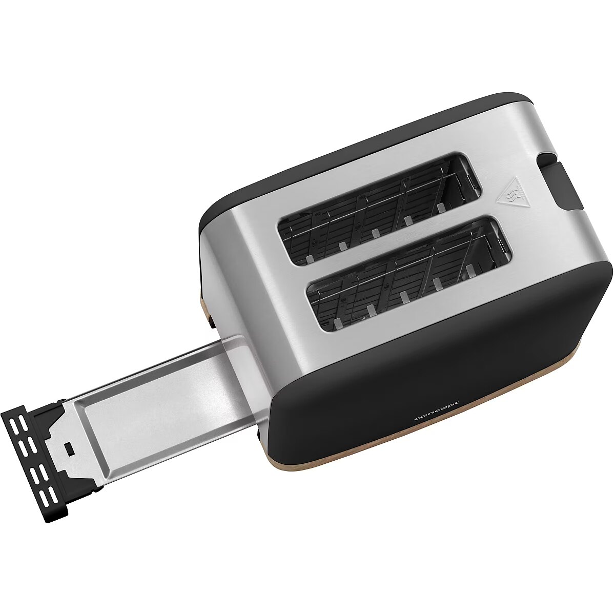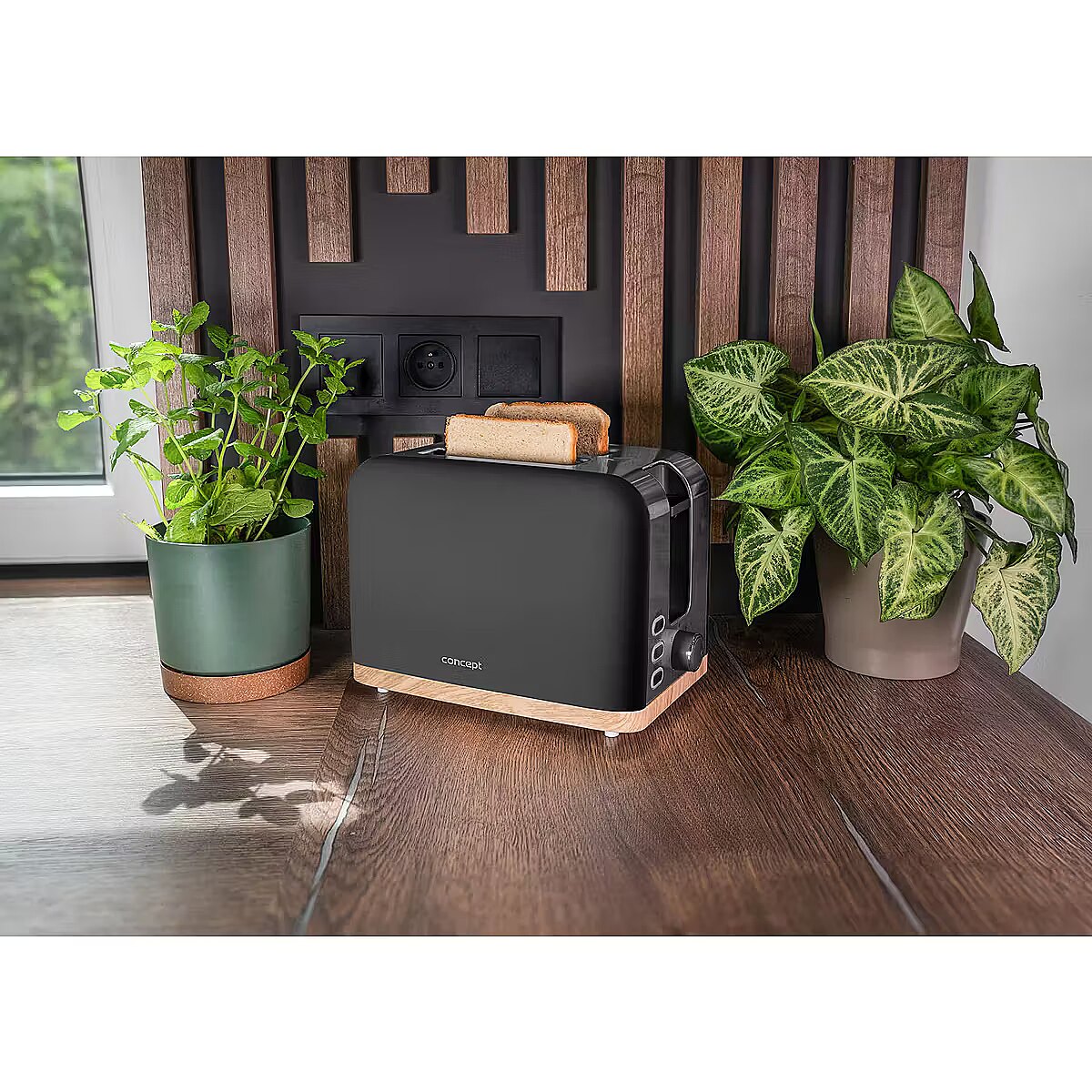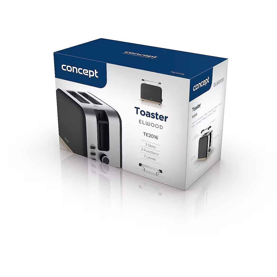 Description - 7 Browning Levels The Concept TE2016 ELWOOD toaster allows you to quickly and easily prepare crispy toast. With 7 browning levels, you can enjoy your bread exactly the way you like it-lightly toasted or perfectly golden. It features two toasting slots and functions for defrosting, reheating, and canceling the toasting process. Once the set time is complete, the bread automatically pops up, and the toaster switches off. Even Toasting The TE2016 ELWOOD toaster comes with an automatic centering function that positions the slice perfectly in the middle of the slot. Your toast will always be evenly browned and ideal every time. Make the Most of Stale Bread The warming rack is perfect for heating baguettes, rolls, or croissants. Its also great for older bread, restoring crispness and freshness. This saves money, as you dont need to throw away bread. The bread heats evenly without burning, while the inside remains soft. Its a practical solution for a quick breakfast without needing to turn on the oven. High Lift for Safe Removal The TE2016 ELWOOD toaster features a high-lift function, making it easier and safer to remove your toast. It also includes a control light and practical non-slip feet to ensure stability during use. If the toaster is placed close to an outlet, youll appreciate the cord storage, keeping your countertop tidy and uncluttered. Stylish Design The minimalist matte black design of the TE2016 ELWOOD toaster looks modern and fresh, with a wood-style detail adding warmth and coziness. This harmonious combination fits various interior styles-from Scandinavian to rustic. Paired with the Concept RK3316 ELWOOD electric kettle, it creates a coordinated and elegant kitchen set. Easy Maintenance Thanks to the crumb tray, maintaining the toaster is quick and simple. After use, just pull it out, empty it, and slide it back in.