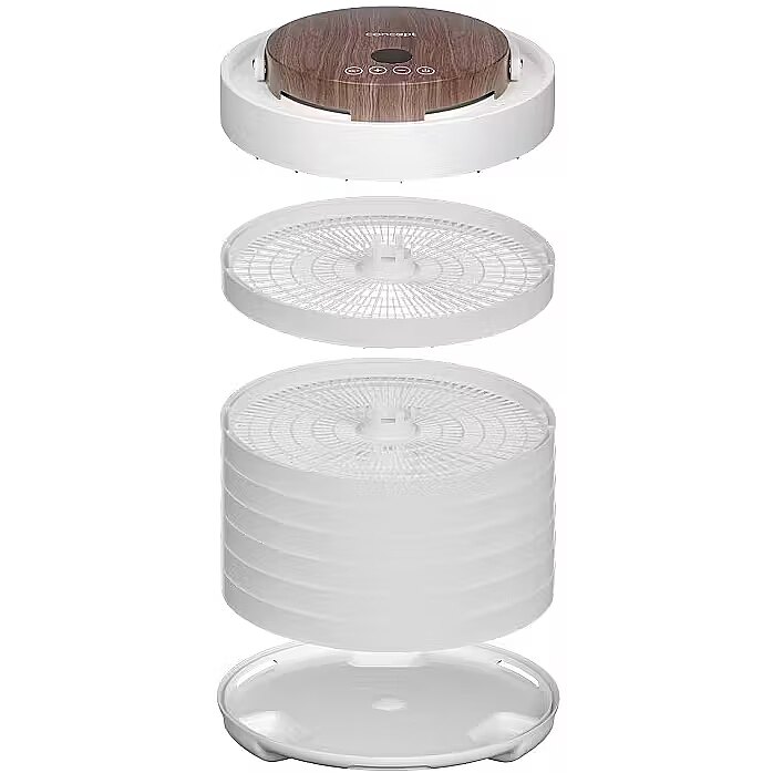 Description - Innovative Design with Motor in the Lid The Concept SO3020 food dehydrator impresses with its modern design, featuring a lid with an elegant wood finish and a practical handle for easy handling. It offers 7 drying trays and an intelligent design solution, with the motor located directly in the lid. This placement protects it from damage caused by dripping juice or food particles that may fall during drying. Its stylish appearance combined with practical details makes the dehydrator not only functional but also an aesthetically pleasing appliance in any kitchen. Even Drying During drying, hot air flows through the openings in each tray from top to bottom and is distributed throughout the interior of the dehydrator by the fan. This ensures the SO3020 model provides even drying on all levels. Healthy Food Preservation Year-Round Drying is one of the gentlest methods of food preservation, retaining valuable vitamins and minerals. It is also a year-round method that allows you to easily process fruits, vegetables, mushrooms, herbs, flowers, or pasta. The dehydrator also helps prepare tasty treats for pets and RAW dishes that are not exposed to temperatures above 42 °C. Intuitive Touch Control with Temperature and Time Settings The SO3020 dehydrator features intuitive digital touch controls with a clear display. It allows easy setting of the temperature from 35 to 70 °C and selection of drying time via the timer. At the end of the process, an audible signal sounds, and the dehydrator automatically turns off.
