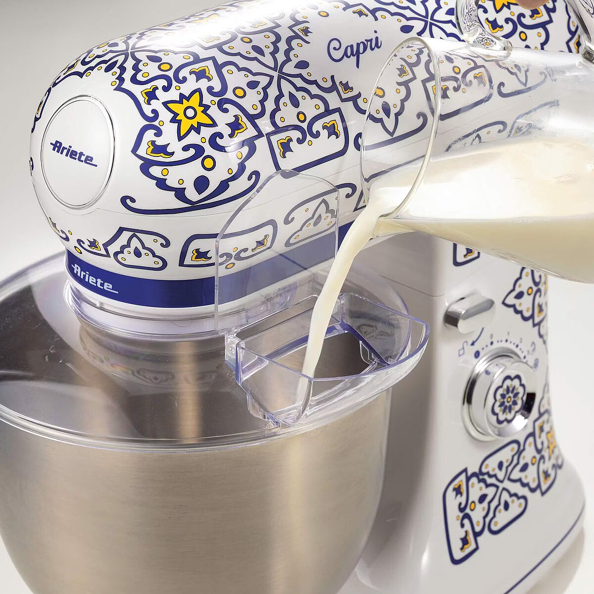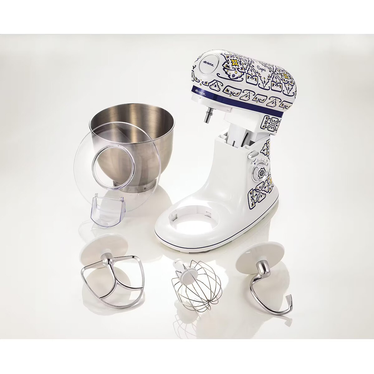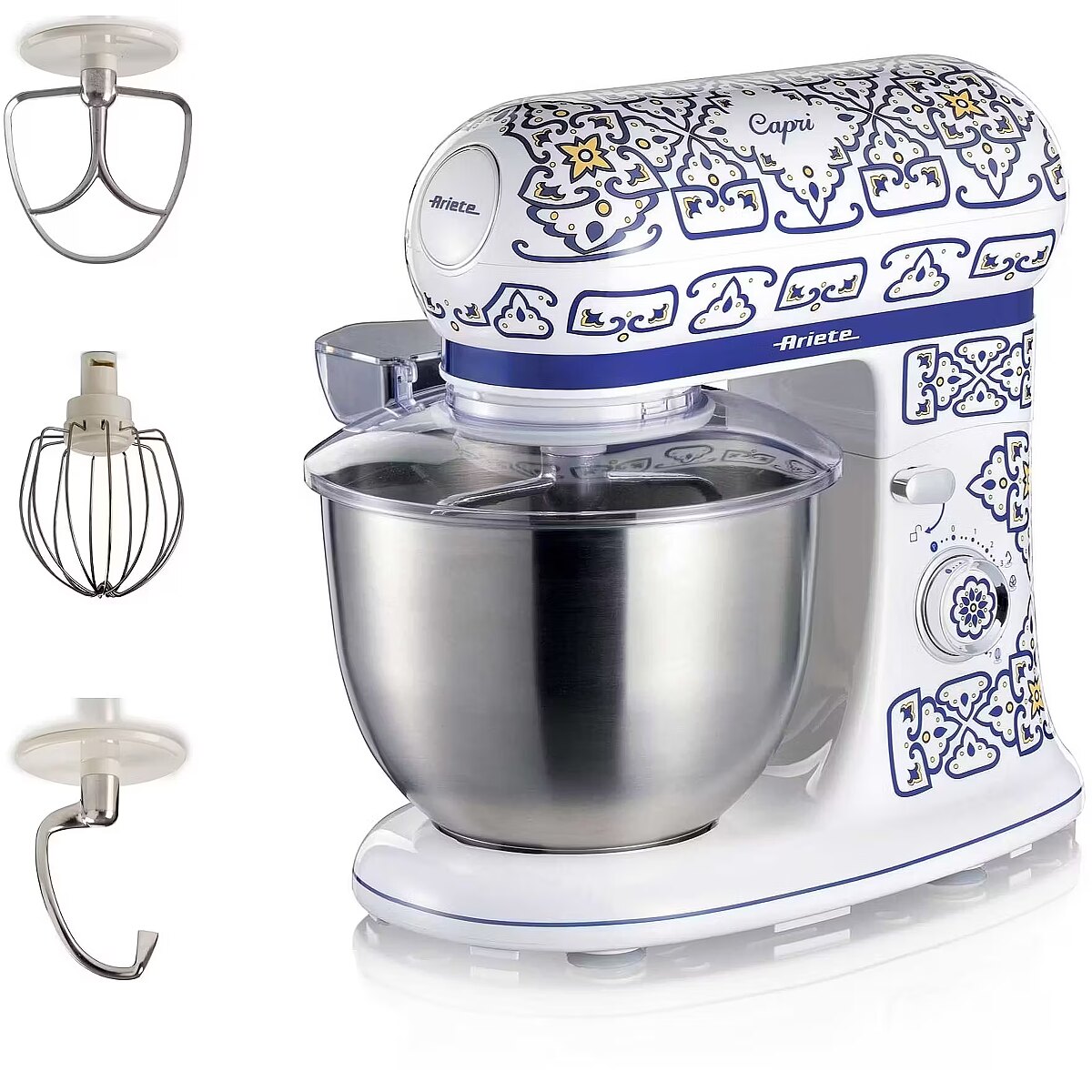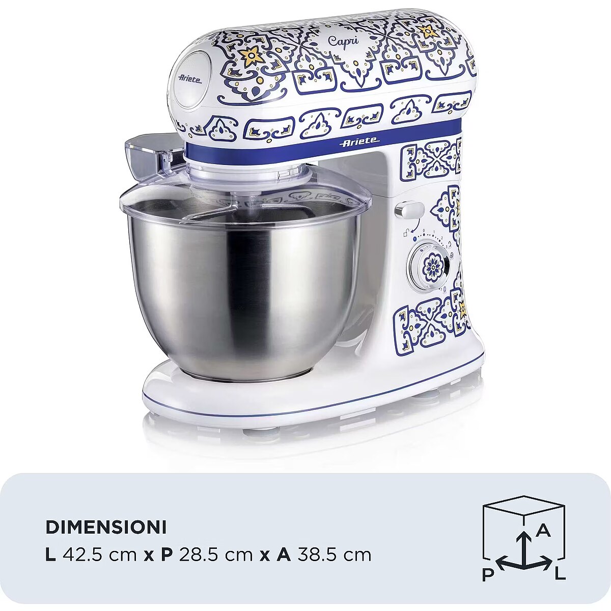 LongDesc - Refined design and cutting-edge functionality to transform your kitchen into an oasis of beauty, the Mediterranean charm of this line is inspired by the unique and vibrant style of the beautiful island of Capri.Mix, blend, whip with the Capri planetary mixer: with the 3 accessories provided (hook, beater and wire whisk), there's no limit to what you can do in the kitchen. With the hook, you can knead the toughest recipes such as pizza or bread dough, or shortcrust pastry; the beater is ideal for mixing and preparing cream and fluffy cake bases, while with the wire whisk you can quickly whip any ingredient, such as eggs or cream.The Capri planetary mixer will make it easier to prepare the more elaborate recipes you would like to make at home, such as bread, homemade pasta, but also pizza, leavened products and special cakes that would require long preparation times. You choose the recipe, the Ariete planetary mixer does it all for you! With its 5.5-litre capacity stainless steel cup, the planetary mixer allows you to process large quantities of ingredients with the best performance, thanks to its 2400Watt motor. You can also adjust the speed, choosing from 7 available speeds, according to the recipe you want to prepare.