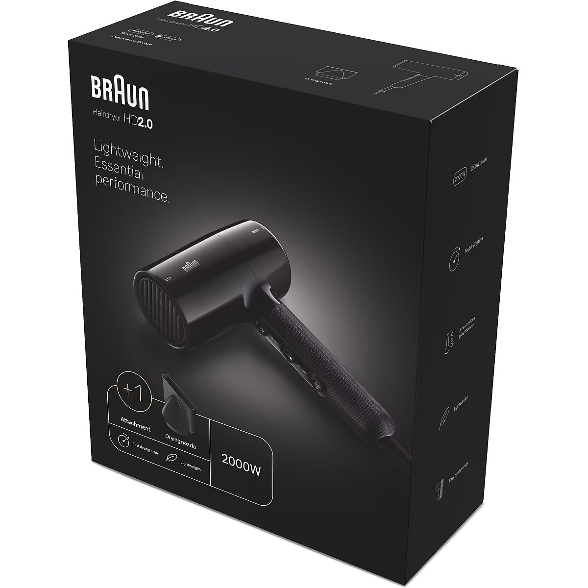 LongSummaryDescription - Braun HD2.0. Product colour: Black, Surface coloration: Monochromatic, Cord length: 1.95 m. Power: 2000 W. Quantity per pack: 1 pc(s), Package type: Box