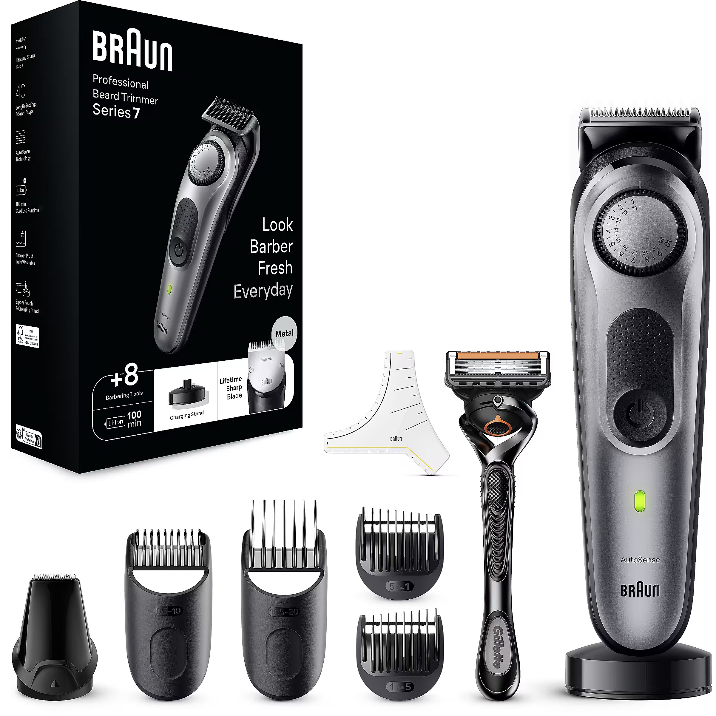 LongSummaryDescription - Braun BeardTrimmer 7 BT7420. Minimum hair length: 0.5 mm, Maximum hair length: 2 cm, Technology: AutoSense. Product colour: Silver. Power source: Battery, Operating time: 100 min, Battery type: Built-in battery. Package type: Box. Number of precision combs: 2 pc(s)