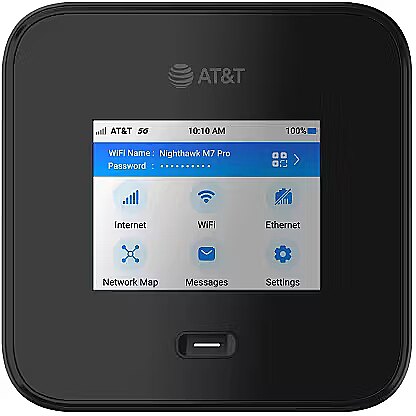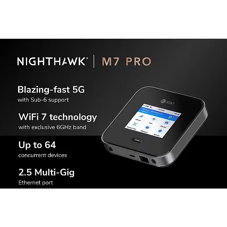 LongDesc - Ultra-fast, portable and secure AT&T 5G with next-gen WiFi 7: Nighthawk M7 Pro delivers ultimate performance with private connectivity for up to 64 devices, everywhere you goThe world’s first WiFi 7 5G mobile hotspot New!Cutting-edge WiFi 7 meets best-in-class 5G technology with current and future 5G Sub-6 capabilities for unmatched internet on-the-goNext-generation tri-band WiFi 7 New!Game, stream, or video call with 8K quality with blazing fast multi-gigabit speeds for 64 devices and achieve multi-gig speeds with the exclusive 6GHz bandFlexible connectivity for all your devices New!Connection options for any device with WiFi 7 and older compatibility, 2.5G Multi-Gig Ethernet, and 10Gbps USB tethering supportHome and travel flexibilityUnlock powerful WiFi anywhere you need it or plug in and remove the battery for high performance in your home or officeReliable internet anytime you need itUp to 13 hours of battery life* keeps you online, whether on-the-go or as a backup solutionSet up and manage on the device or on the webUse the 2.8” color LCD touch screen to change settings and monitor usage, or access the powerful web interface for advanced configurationNETGEAR Insight Pro compatibleSupports Insight Pro to remotely manage, deploy, and configure enterprise mobile hotspot devices with complete visibility (subscription required)Qualcomm Snapdragon® X75 5G Modem-RF SystemThe world’s first Modem-RF System ready for 5G Advanced – 6Gbps 5G peak download and 1Gbps peak upload speeds, unmatched latency, coverage and power efficiencyKeep sensitive data secureSafeguard your devices from online threats on public WiFi, like a portable shield of securityConnect with confidenceBuilt-in URL filtering, device blocking, and LCD passcode locking lets you protect your family and enjoy a safer online experience, anywhere life takes youKeep sensitive data secureUsing public WiFi networks puts your private data at risk. With M7 Pro, you can use your own secure WiFi network anywhere with no worries.Fast, reliable WiFi anywhere you goEnsure you have the best WiFi at all times with 5G-powered WiFi can go anywhere you do: Instantly connect the entire job site, host a livestream, or join a Zoom call from anywhere. Get more speed and connectivity than a mobile phone hotspot and stop draining your battery.Ultra-fast and reliable wired connectionsWhen you need incredible speed and reliability, Nighthawk delivers. Blaze through your most important tasks with wired speeds up to 10Gbps over USB-C and 2.5Gbps over Ethernet.All-day powerNighthawk M7 Pro offers a powerful battery with up to 13 hours of battery life*, so you can rely on it for even the most challenging days, without worry.
