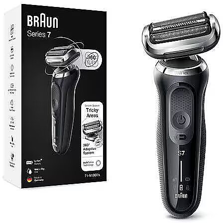 Technical_details - Type: Razor Color: Black EAN: 4210201433804 Manufacturer No.: 71-N1000s Series: Series 7 Power supply: built-in rechargeable battery : Yes : 100 - 240V : Li-Ion : 50 minutes : 1 hour : 5 minutes Use: shaving Application: Wet, Dry Shaving/Cutting System: 3 flexible shaving elements Shaving head: Movable shaving head, contour adjustment : 360° flex head Display: LED display (battery status, cleaning status, replacement indicator, travel lock status) Cleaning: Fully washable Storage: travel case Notes: Non-slip handle for safe handling Feature: AutoSense technology, Wet&Dry technology Accessories: 1x travel case, 1x power adapter with automatic adjustment to 100V to 240V, 1x cleaning brush