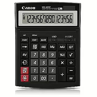 LongDesc - Features- Tax Calculation plus an extensive range of functions- Adjustable LCD display panel- ‘IT-touch’ keypad- Dual power source: battery and solar- Compact and lightweight with smart and professional look 16-digit desktop calculator with Tax functions and friendly IT-touch keypadComprehensive functions with Tax CalculationThe 16-digit WS-1610T calculator offers an extensive range of functions. Three Tax Calculation keys handle tax rates at a touch. A slide switch provides easy decimal point selection and rounding. The Grand Total memory automatically accumulates totals. Other convenient keys include Mark-up, Sign Change, Reverse and all the regular functions you’d expect from a Canon calculator.Adjustable LCD display panelA large and clear adjustable LCD display panel minimises glare and reflection. Simply tilt the panel for optimum legibility and comfort in any light conditions. Figures remain easy to read even after extended use.Friendly ‘IT-touch’ keypadCanon’s spacious ‘IT-touch’ keypad ensures easy and efficient operation. The concept is based on a computer keyboard design for steady and accurate entries. Key rollover functionality allows speedy entry without keys blocking. Big colour-coded key tops are durably moulded to withstand heavy-duty use.Practical dual power sourceA battery and solar dual power source ensures reliable use anywhere and everywhere - whatever the light conditions.Smart and professional styleThis compact and lightweight black calculator has a smart and professional look. It’s designed to fit neatly on your desk or shelf.