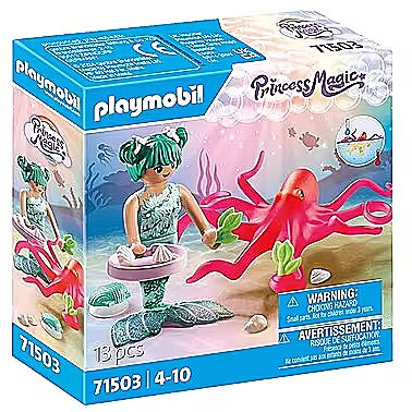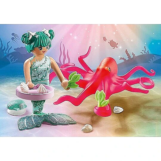 Description - The mermaid takes care of the octopus and feeds it delicious leaves. In warm water, the octopus changes color. With decorative shell to attach to smooth surfaces (incl. suction cups). Come into the fantastic PLAYMOBIL underwater world with the sweet play figure set, Mermaid with Color-Changing Octopus. The mermaid is visiting her good friend, the octopus. Out of sheer joy, the large octopus immediately turns yellow. What a fun meeting! With imaginatively designed figures and animals, as well as fantastic accessories, the PLAYMOBIL Princess Magic Underwater World invites children into a magical play universe. The set includes a mermaid, hair bows, a decorative shell with suction cup, and an octopus. The octopus changes color with the alteration of water temperature.