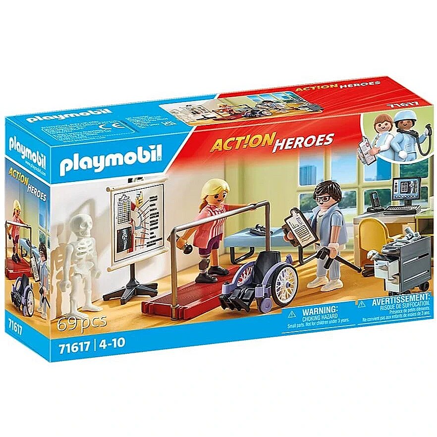 In the orthopaedic ward, the patient practises walking with her new prosthesis under the watchful eye of a specialist, of course. With a wheelchair, walking stick, couch, removable tape bandages and many other accessories to ensure proper patient care. Can be combined with other sets from the PLAYMOBIL Action Heroes Rescue series.