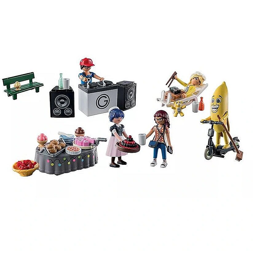 Accessories included - Marinette Adrien in a banana costume Alya Nino Chloé Smartphone Table 3 ice cream cups 3 plates 3 spoons Scooter Broom Tray of cinnamon rolls Basket 3 apples Tray of macaron Pair of sunglasses Deckchair Tray of sushi Chopstick Teddy bear Cake Cake scoop with a piece of cake DJ table 2 jukeboxes 3 cups Bench 2 bottles Cake Stand Parisian park diorama
