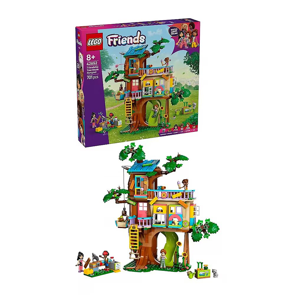 Description - See imaginations grow with this LEGO Friends Friendship Tree House Hangout (42652) building kit. This detailed kids set lets girls and boys aged 8 and up create their own friendship adventures. It comes with 4 LEGO Friends minidolls, a dog figure and a raccoon figure, plus a buildable workbench with tools. This set is packed with fun stories, as the characters Liann, Autumn, Leo and Zac enjoy time together in the tree house they have built. There are spaces for playing, cooking and sleeping, plus a veggie patch with carrots to pick. Sweet details include the elevator that Pickle the dog uses and the raccoons secret hideaway. Boost creativity as kids use the special tiles to add their own finishing touches to the tree house design. The window details are also interchangeable, so young builders can customize their model even further. Check out other social development toys in the LEGO Friends universe, where there are lots more stories to uncover (sets sold separately). Tree house toy building kit for kids This Friendship Tree House Hangout for girls and boys aged 8 and up comes with customizable elements and lots of accessories for creative role play A set filled with friendship stories This tree house playset inspires kids to role-play different stories, with spaces for the characters to play, cook and sleep in, plus a veggie patch Ladder, slide and dog elevator Fun features include the retractable ladder, the slide and the elevator that Pickle the dog uses to access the different levels of the tree house Includes 4 minidolls and 2 animal figures Comes with 4 characters and dog and raccoon figures, plus accessories such as sunflowers, vegetables, snacks, a keyboard, a workbench with tools and more A tree house playset gift for kids This set makes a great gift for girls, boys and kids aged 8 years old and up who love animals, nature and friendship-based role play Online show Inspire more creative-play ideas with other sets (sold separately) and the LEGO Friends: The Next Chapter online show, where kids can get to know the characters of Heartlake City Measurements 701-piece set with a tree house model measuring over 12 in. (31 cm) high, 11 in. (28 cm) wide and 5.5 in. (15 cm) deep