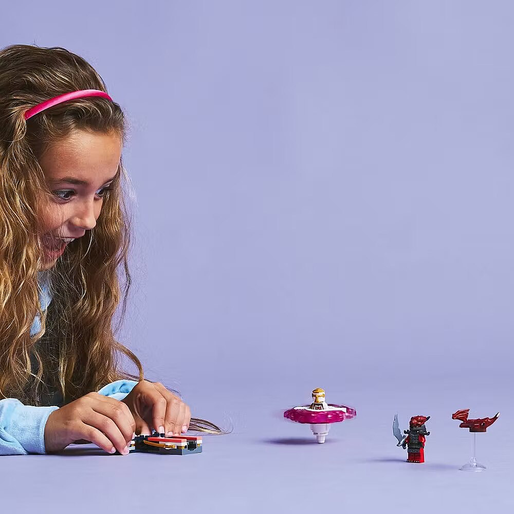 The rest of the LEGO NINJAGO range of building sets for kids and battle toys includes mechs, dragons and temples so fans can role-play awesome ninja action. Each ninja playset can be created with the LEGO Builder app, which guides you and your child on an easy and intuitive building adventure.     LEGO NINJAGO action toy for kids Boys and girls aged 6 and up can play out action-packed scenes from season 3 of the NINJAGO Dragons Rising TV show with Soras Dragon Spinjitzu Spinner     Fast-paced spinner toy Push the launchers button to unleash Soras Dragon Spinjitzu Spinner into a rapid spin and watch as 2 power elements possibly fly off when it hits its target     2 NINJAGO minifigures This building set for kids comes with Sora, who rides inside the Spinjitzu spinner, a villainous Dragonian Warrior, plus a small dragon critter model     Weapon accessories Each NINJAGO character has a weapon for enhanced play value: Sora comes with sword accessory and the Dragonian Warrior has his own sword accessory     Ninja gift idea for kids This small LEGO set provides a fun build-and-play experience and is a treat gift idea for ninja fans with a passion for imaginative play and adventure toys     Bigger ninja adventures Look out for more LEGO NINJAGO toys (sets sold separately) featuring dragons, temples and vehicles     A universe of LEGO NINJAGO toys This extensive collection of kids toys (sets sold separately) lets children escape into a fantasy world for imaginative play with their ninja heroes     Measurements This 56-piece Soras Dragon Spinjitzu Spinner LEGO building set for kids measures over 2 in. (6 cm) high, 4 in. (10 cm) long and 3.5 in. (9 cm) wide