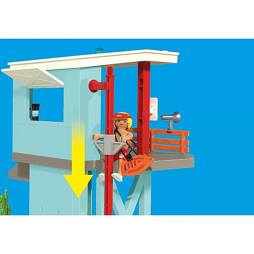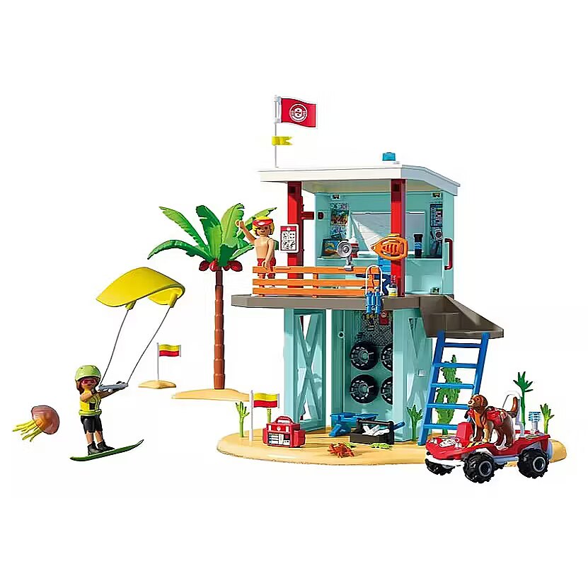 Description - O nie! Meduza złapała kitesurfera za nogę. Jak dobrze, że ratownik z wieży ratowniczej stale obserwuje plażowiczów i kąpiących się w wodzie. Błyskawicznie chwyta deskę ratunkową i pędzi na miejsce zdarzenia. Jego pies w kamizelce ratunkowej aktywnie wspiera go w bezpiecznym doprowadzeniu poszkodowanego na plażę, a następnie opatrzeniu go. W przypadku misji odbywających się z dala od wieży ratowniczej, ratownik korzysta z pojazdu plażowego. W dolnej części wieży znajduje się mały warsztat naprawczy z szeroką gamą akcesoriów. Słońce, plaża i akcje ratunkowe to codzienność w wieży ratowniczej PLAYMOBIL! Dwupoziomowy budynek z rurą zjazdową i w pełni wyposażonym stanowiskiem ratownika pozwala szybko reagować na wezwania z plaży. Meduza ognista i krab dodają scenerii życia, a plażowy pojazd mieści jedną figurkę i deskę ratunkową - idealnie do błyskawicznego ruszenia na pomoc! Na dolnym poziomie znajduje się warsztat z narzędziami i zapasowymi oponami. W misji pomaga też dzielny pies ratowniczy w kamizelce oraz zestaw do kitesurfingu. Ten bogaty w szczegóły zestaw PLAYMOBIL to mnóstwo akcji, akcesoriów i letniej zabawy bez końca!