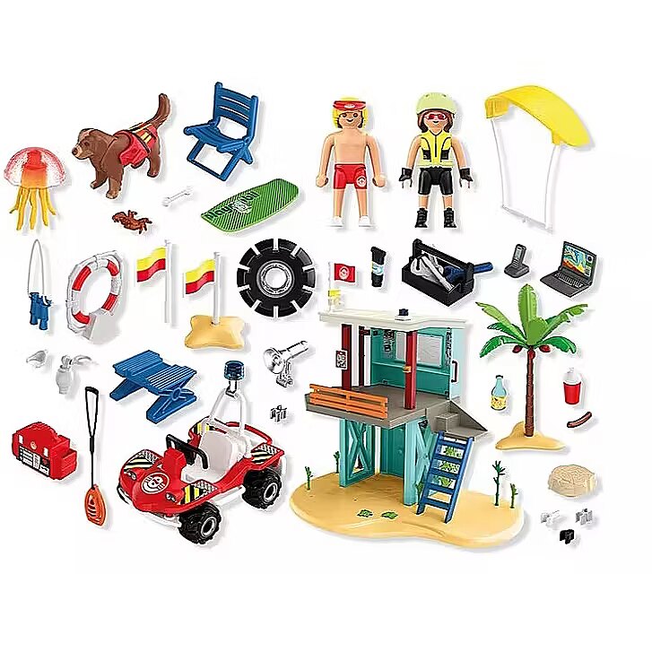 Accessories included - Figurki: 1 mężczyzna w czapce z daszkiem, 1 kobieta w hełmie Zwierzęta: 1 pies z kamizelką ratunkową, 1 krab, 1 ognista meduza Akcesoria: 1 wieża ratunkowa z drążkiem ratunkowym i schodami, 1 składane krzesło, 1 laptop, 1 telefon, 1 kubek do picia ze słomką, 1 butelka na napój, 1 krem przeciwsłoneczny, 1 apteczka z wyposażeniem, 1 tablica ratunkowa, 1 megafon, 1 ostrzeżenie oświetlenie, 1 flaga, 2 flagi ostrzegawcze, 1 flaga stojakowa, 1 rampa, 1 skrzynka narzędziowa z akcesoriami, 1 komplet zapasowych opon, 1 wózek plażowy, 1 koło ratunkowe, 1 parasol z latawcem, 1 drążek z latawcem