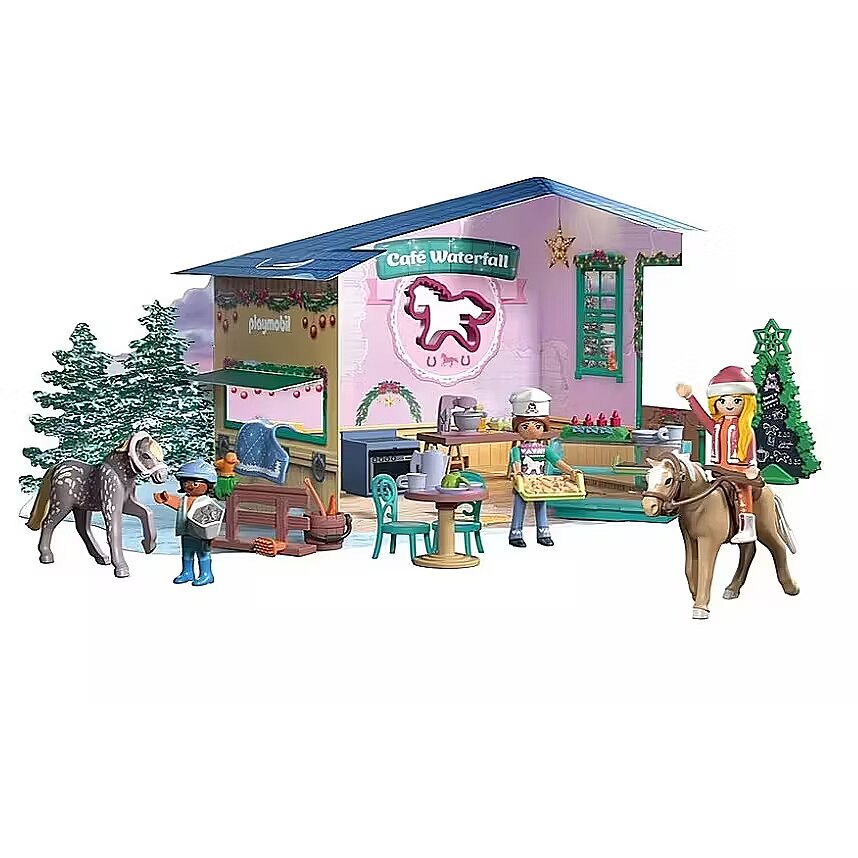 Description - Święta Bożego Narodzenia w Waterfall zbliżają się wielkimi krokami. Mmmmh - niebiański zapach ciasteczek i ponczu unosi się w przytulnej, małej kawiarni Ellie. Smakołyki dla koni są już przygotowane. Dodatkowo dzięki pomysłowej foremce do ciastek w kształcie konia możesz upiec ciasteczka również w domu. W świątecznej kawiarence Ellie magia Bożego Narodzenia spotyka się z urokiem wiejskiego życia. Dzieci mogą pomagać w pieczeniu sezonowych smakołyków, używając uroczej foremki w kształcie konika - idealnej do wspólnej zabawy w domowej kuchni. Piekarnik się otwiera, więc pierniczki lub ciasteczka można upiec i podać z bożonarodzeniową radością. Udekoruj kawiarenkę, podnieś szklaną witrynę i ułóż wypieki na ladzie tak, jak chcesz. Zestaw PLAYMOBIL pełen zwierząt, świątecznych dodatków i rodzinnego ciepła to gwarancja niekończącej się, kreatywnej zabawy. Idealny na każdą świąteczną przygodę!
