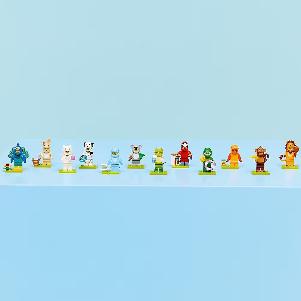 Each box contains one random LEGO minifigure, for a total of 12 characters to collect, including costumed figures of a parrot, lion, frog, crocodile, Dalmatian, goldfish, adorable bunny, peacock, fluffy cat, koala, dolphin, and monkey. Each of the 12 minifigures comes in a sealed mystery box, and each comes with at least one accessory.