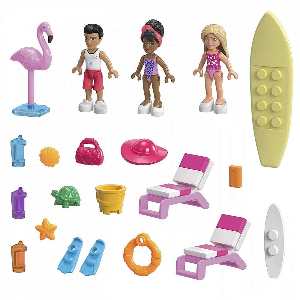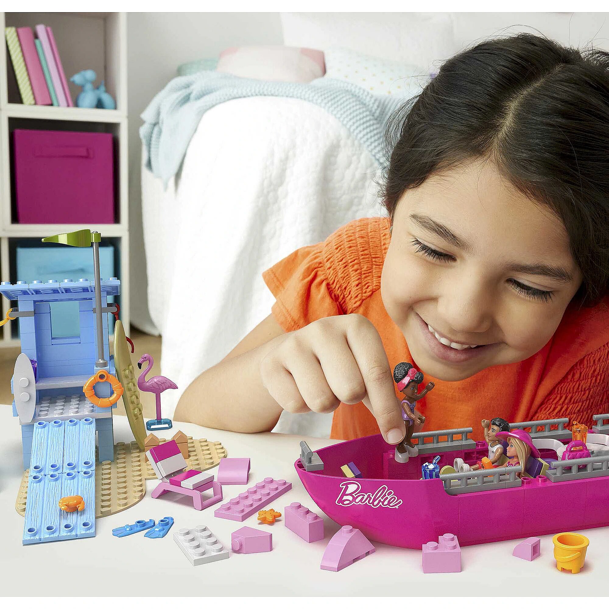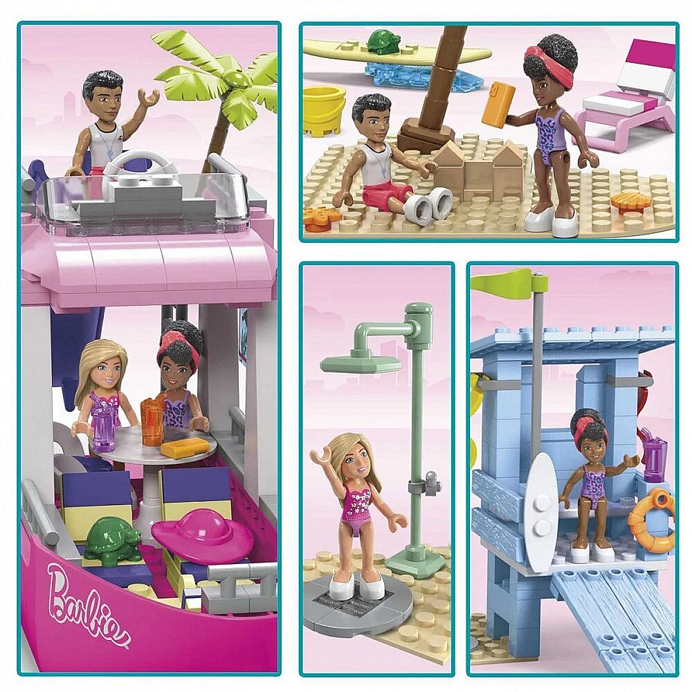 LongDesc - Kids can join Barbie and her friends for a beach splash adventure when they build the Malibu Dream Boat. This buildable Dream Boat features lounge chairs, TV, seating area, slide and sundeck. The top of the boat can be easily removed to access the main deck for interior play. Kids can also build the Malibu lifeguard tower with an outdoor shower and paddle board to ride the wave.