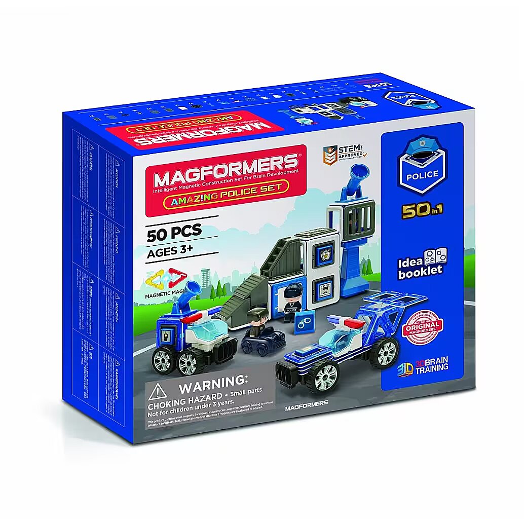Description - Construction blocks Magformers Police set Click and create your own adventure with Magformers AMAZING Police 50-Piece Set! Magformers are a magnetic construction toy where the possibilities are endless. Take off in a police car and chase the bad guy. This 50 piece set comes with 24 magnetic pieces, 2 figures, an emergency vehicle siren and much more to keep the city safe. Great for children aged 3 and up. Create 50 ideas with the follow-along idea booklet or build your own adventure! Each geometric shape contains magnets that never reject, so youll always hear the MAGFORMERS click. When playtime is over, use the magnetic power to simply stack and store.