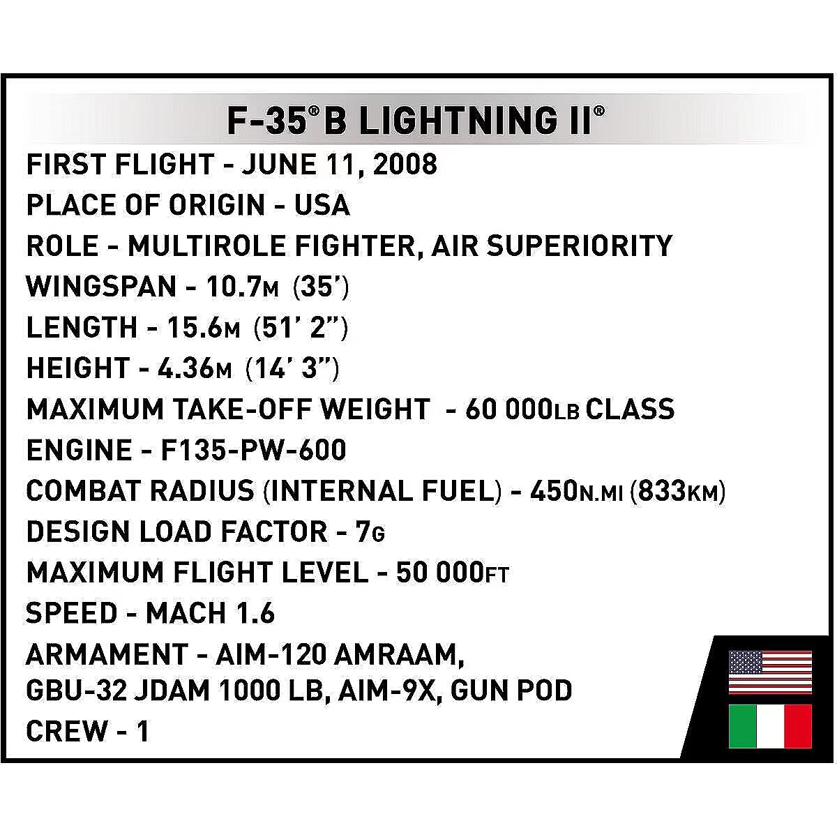 Description - Klocki F-35B Stovl Lightning II 610 klocków F-35B LIGHTNING II to jednomiejscowy, wielozadaniowy myśliwiec zaprojektowany przez korporację Lockheed Martin. Włochy są jednym z państw europejskich, które posiadają myśliwce wielozadaniowe F-35B, czyli wersję skróconego startu i pionowego lądowania. Pierwsze maszyny F-35B zostały dostarczone do Włoch w 2018 roku. Obecnie te myśliwce służą zarówno w lotnictwie Włoskiej Marynarki Wojennej (Marina Militare), jak i w Włoskich Siłach Powietrznych (Aeronautica Militare).