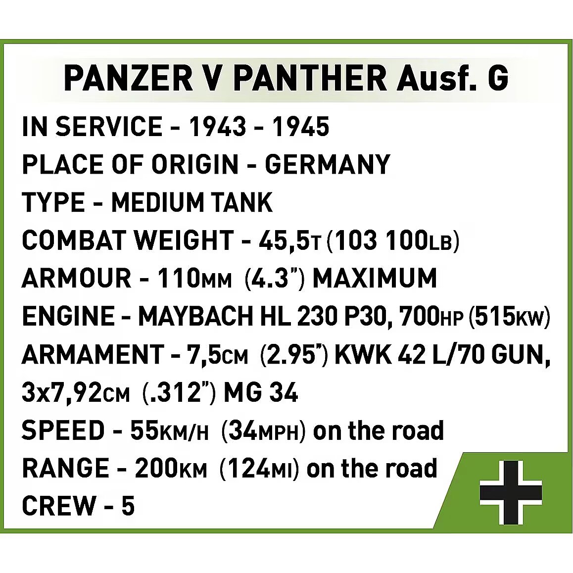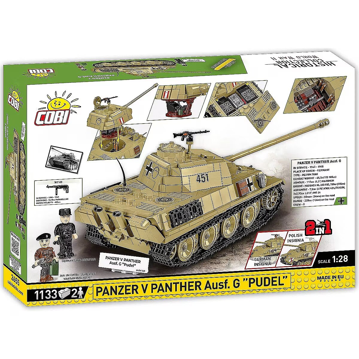 Description - Klocki Panzer V Panther G Pudel 1133 klocków Zbuduj Panzer V PANTHER Ausf.G Pudel od COBI krok po kroku i poczuj, jak ten legendarny pojazd ożywa w Twoich rękach! Konstruując ten czołg, stworzysz imponujący model, który zachwyci każdego miłośnika klocków, kolekcjonera i pasjonata historii Panzer V PANTHER Ausf.G to jeden z najważniejszych niemieckich czołgów II wojny światowej, a jego wersja Pudel zyskała szczególne znaczenie w historii Polski, kiedy to czołg został zdobyty przez powstańców warszawskich w sierpniu 1944 roku. Interaktywna zabawa i realizm - model wyposażony jest w ruchome działo, otwieraną klapę oraz obrotową i wyjmowaną wieżę czołgową, co zapewnia wyjątkowy realizm i umożliwia kreatywną zabawę. Realistyczna konstrukcja - w zestawie znajdziemy wyjmowany silnik Maybach HL-230, który można wyeksponować obok modela. Precyzyjne detale historyczne - zestaw zawiera szczegółowe odwzorowanie karabinów maszynowych oraz gąsienic, które są inspirowane autentycznym sprzętem z II wojny światowej, co czyni model wyjątkowo realistycznym. Kolekcjonerski wymiar - dwie figurki - niemieckiego czołgisty oraz Polaka Jana Uniewskiego ps. Lumeński który uruchomił zdobyczny czołg w czasie Powstania Warszawskiego, dodają wyjątkowego kontekstu historycznego. Przydomek Pudel - czołg go otrzymał na cześć oficera Tadeusza Tyczyńskiego, który zginął podczas walk, a model oddaje hołd tym, którzy walczyli o wolność Polski. Łatwy i satysfakcjonujący proces budowy - dzięki szczegółowej instrukcji budowa czołgu jest prosta i przyjemna, a wysokiej jakości klocki COBI gwarantują precyzyjne dopasowanie i trwałość modelu. Kreatywność i satysfakcja - doskonale wyprofilowane elementy sprawiają, że łączenie klocków jest łatwe i przyjemne, a efekt końcowy daje ogromną satysfakcję z wykonania precyzyjnego, historycznego modelu. Emblematy narodowe - model posiada emblematy narodowe Polski, takie jak symbol Polski Walczącej i lilia harcerska. Możliwość wymiany na emblematy niemieckie daje Ci pełną swobodę w dostosowywaniu modelu. Rozbudowa kolekcji - sprawdź inne pojazdy z serii HISTORICAL COLLECTION World War II i stwórz własną, unikalną kolekcję historycznych maszyn! Panzer V PANTHER Ausf.G Pudel to idealna okazja, by zbudować jeden z najbardziej znanych pojazdów wojskowych w historii Powstania Warszawskiego, zgłębiając przy tym fascynujące tajemnice przeszłości. Zestaw to także świetny wybór dla dorosłych kolekcjonerów, którzy docenią wysoką jakość i dbałość o detale. Wyprodukowane w UE przez firmę z ponad 35-letnią tradycją Spełniają normy bezpieczeństwa dotyczące produktów dla dzieci W pełni kompatybilne z innymi markami klocków konstrukcyjnych Czytelna i intuicyjna instrukcja oparta na rysunkach i ikonach