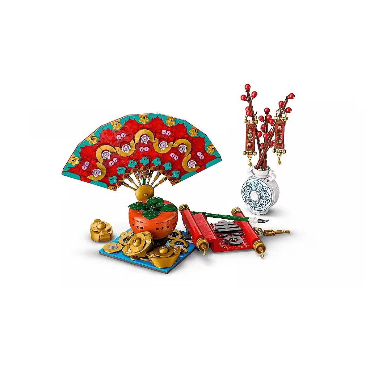 Description - LEGO Okolicznościowe 80117 - Pomyślność Stwórz piękną dekorację z okazji Święta Wiosny i wywróż rok pomyślności dzięki temu szczegółowemu modelowi (80117). Ten zestaw to świetny prezent dla dzieci w wieku od dziewięciu lat, który gwarantuje rozrywkę dla całej rodziny. To także okazja do tego, aby rodzice dzielili się tradycjami z dziećmi. Model prezentuje kultowe przedmioty symbolizujące przyszłość pełną miłości, dobrego zdrowia, dobrobytu i radości: piękny wachlarz ozdobiony dwiema srokami (symbol, że dobre rzeczy chodzą parami!) przelatującymi nad wiosennymi kwiatami, wazon z czerwonymi owocami, owocami persymony, sztabkami złota i piórem ze zwojem z chińskim napisem oznaczającym "wiosnę". Ten zestaw LEGO obejmuje dwie wersje wachlarza (instrukcja w zestawie), a pozostałe elementy można odczepić od podstawy, dzięki czemu konstruktorzy mogą stworzyć wyjątkową, świąteczną dekorację wedle własnego uznania. Ten kolekcjonerski zestaw łączy się z innymi zestawami z serii LEGO Spring Festival (sprzedawanymi osobno). Zestaw LEGO Spring Festival Pomyślność - zainspiruj dzieci i całą rodzinę do stworzenia symboli pomyślności z okazji Roku Węża dzięki temu szczegółowemu modelowi Zabawka do zbudowania - stwórz symbole szczęścia, w tym wachlarz ozdobiony dwiemasrokami, wazon z czerwonymi owocami, owoc persymony, trzy sztabki złota i pióro do kaligrafii ze zwojem Rodzinna rozrywka - zainspiruj dzieci do poznawania tradycji i rozwijania umiejętności społecznych, a jednocześnie zorganizuj fajną zabawę, budując ten wyjątkowy model z rodziną i przyjaciółmi podczas Święta Wiosny Personalizowana ozdoba - wachlarz można zbudować w dwóch wersjach (instrukcja w zestawie) i obracać go na podstawce, a pozostałe elementy można odczepić, aby stworzyć własną kompozycję Prezent dla dziewięciolatków i starszych dzieci - ten zestaw LEGO to świetny prezent z okazji Święta Wiosny Budowanie ze znajomymi i rodziną - aplikacja LEGO Builder oferuje świetną zabawę w większym gronie, aby dzielić się radością budowania z klocków LEGO Kolekcjonerska zabawka - ten zestaw łączy się z innymi z serii LEGO Spring Festival (sprzedawanymi osobno), które także zapewnią rozrywkę w większym gronie Wymiary - ten 1021-elementowy model ma 20 cm wysokości, 28 cm szerokości i 17 cm głębokości