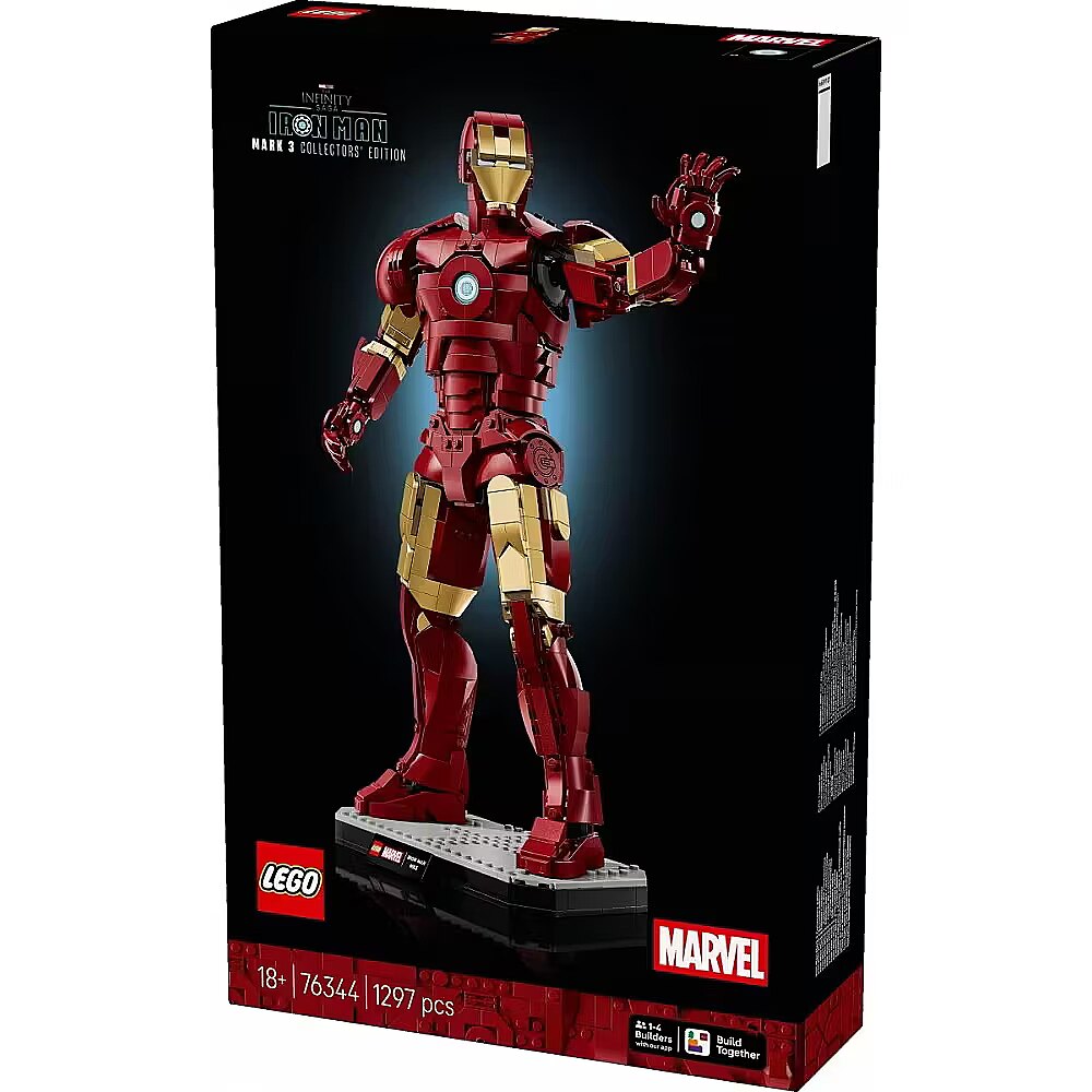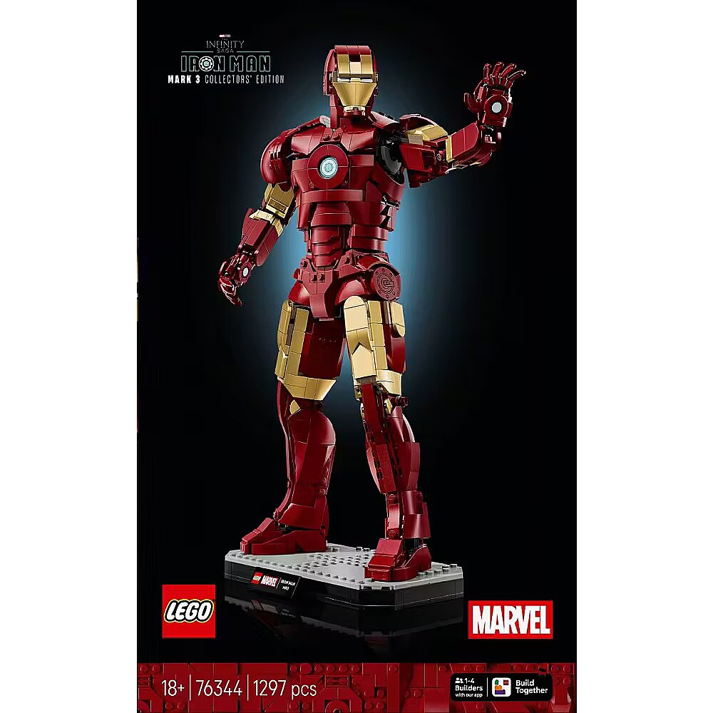 Description - Adult fans of Super Hero action can recreate Iron Mans appearance in Marvel Studios Avengers: Infinity Saga with the LEGO Marvel Iron Man Mark 3 Collectors Edition (76344) figure. This impressive, 1,297-piece building set stands over 15 in. (38 cm) tall, making it a great birthday or any-day gift for men, women, Iron Man Fans and LEGO lovers ages 18 and older. Put the authentically detailed Iron Man Mark 3 armor into dynamic display poses by repositioning the jointed neck, waist, shoulders, wrists and hands. The LEGO Marvel figure is decorated with gold-lacquered accents and stands on a sturdy base with a name plaque, creating a stunning piece of Super Hero decor. As an extra treat, theres also an Iron Man minifigure included, also ready for action in his Mark 3 armor. Builders can download the LEGO Builder app for a collaborative Build Together experience with friends and family. Building set contains 1,297 pieces. RON MAN BUILDING SET Adult fans can indulge their passion with LEGO Marvel Iron Man Mark 3 Collectors Edition (76344), a posable display figure standing over 15 in. (38 cm) tall