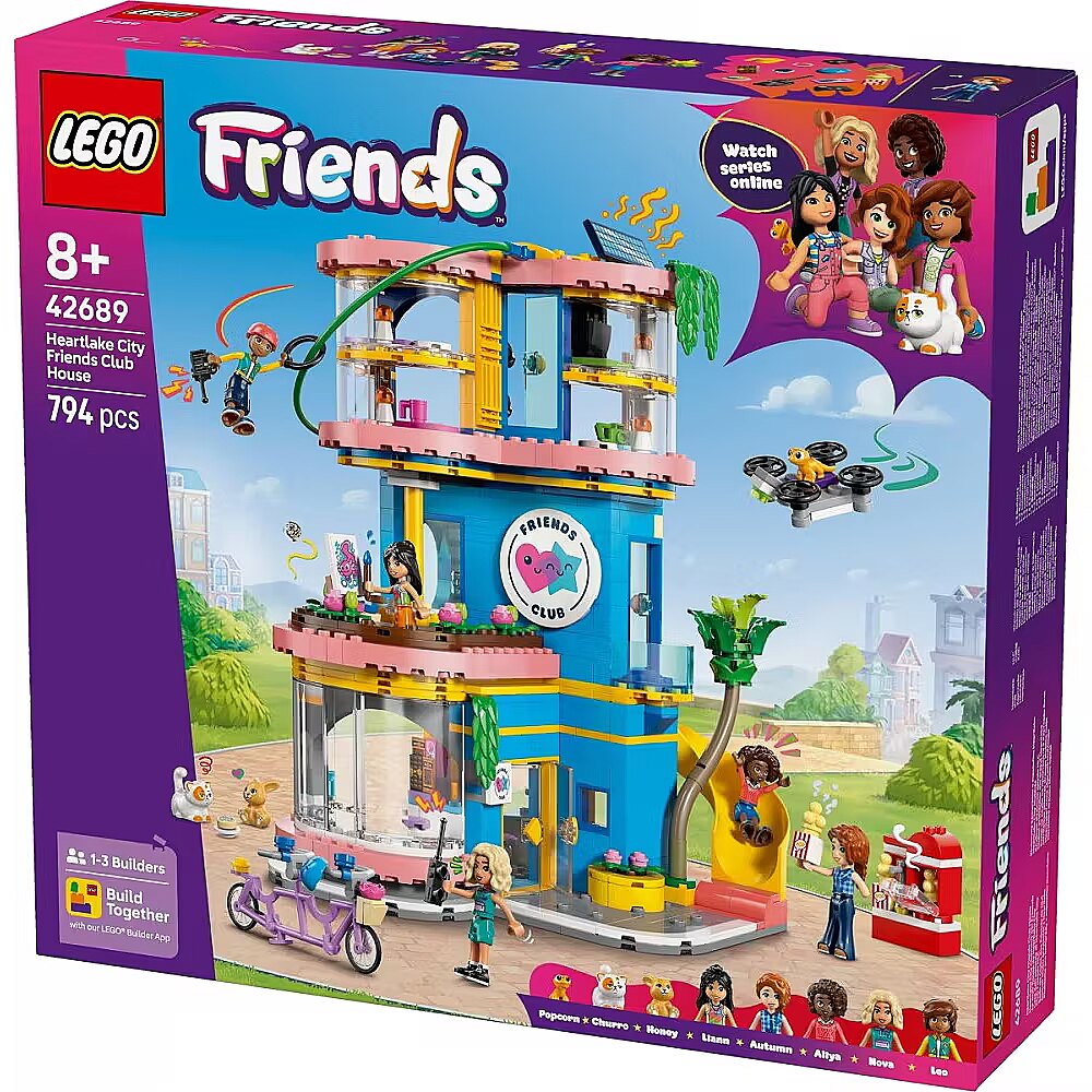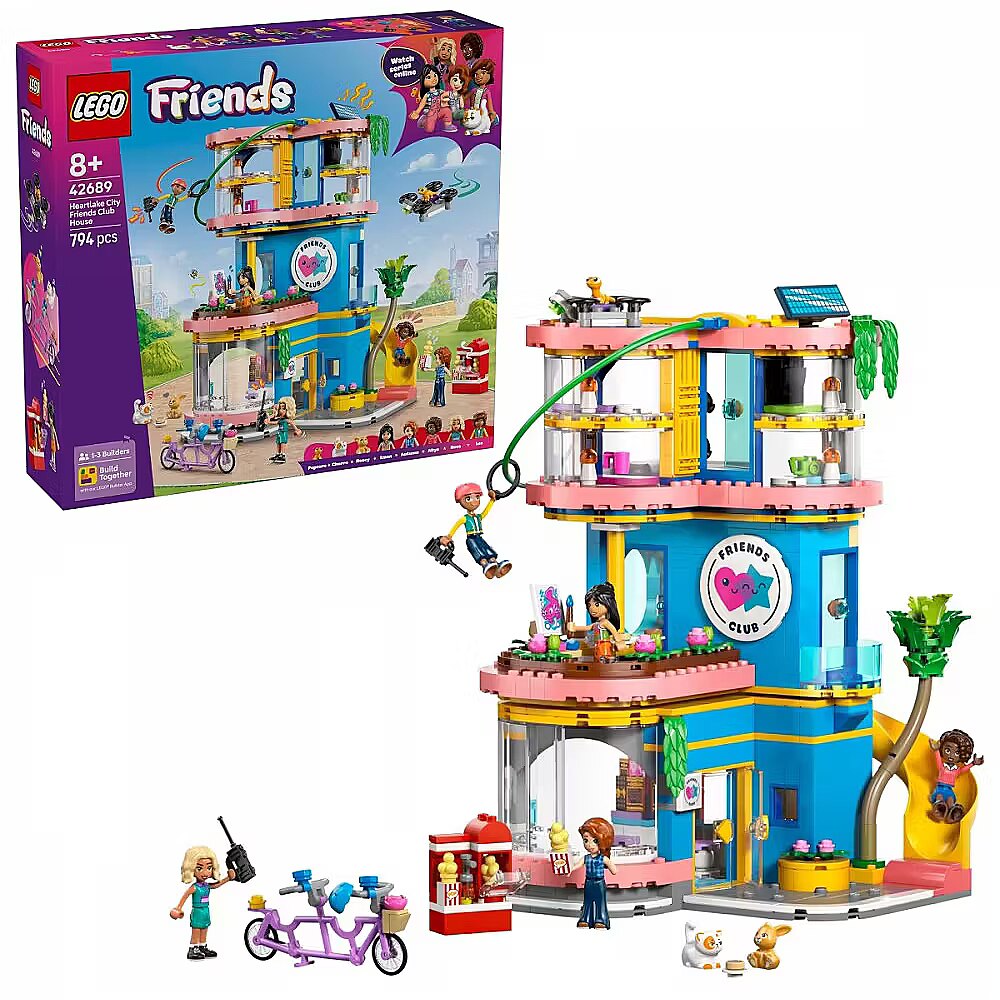 Description - Blocks Friends 42689 Heartlake City Friends Club House While playing with the LEGO Friends Heartlake City Friends Club House set (42689), children aged eight and up can let their imaginations run wild. With this set, girls and boys can create secret missions and endless stories. Enjoy adventures on the zip line, slide, and climbing wall. Solve a mystery using the hidden computer and drone. Take care of the animals, create art at the easel, or prepare snacks in the kitchen. Whatever their interests, kids can explore their passions here! This building set includes five mini-dolls as well as a cat, a gecko, and a rabbit. There are also plenty of imagination-sparking accessories, including animal bowls and water, a popcorn machine, a gaming TV with controllers, a fridge, donuts, strawberries, waffles, and much more. This childrens building set makes a great gift for girls and boys who love role-play toys and creative activities. You can team up with friends and family using the Build Together mode in the LEGO Builder app, where everyone can enjoy building part of the set on their own device. The set contains 794 pieces.
