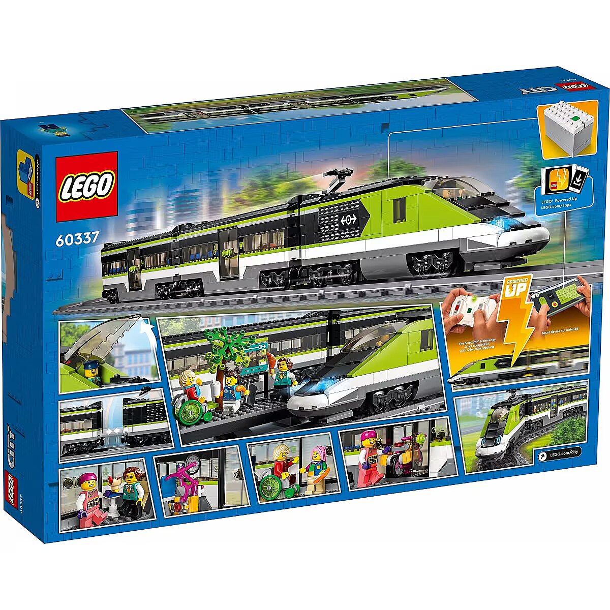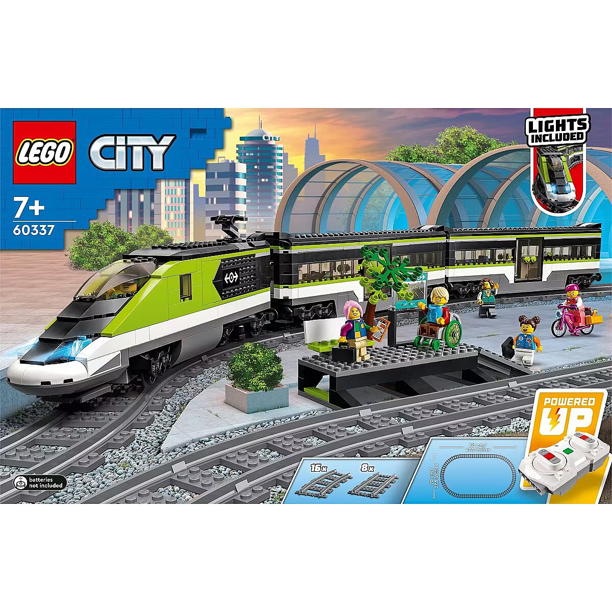 Description - The LEGO City Express Passenger Train set (60337) includes a remote-controlled bullet locomotive with working, dimmable headlights and LEGO Powered Up technology, a dining car, passenger car, station platform, 24 track pieces and 6 minifigures for endless hours of train-themed role play. Designed for kids and train enthusiasts This amazing buildable toy train set comes with an easy-to-follow building guide for each model. Kids aged 7+ can choose to build independently or join friends and family members for an awesome group build-and-play experience. More than just cool toys for kids LEGO City playsets take kids to the heart of the action with realistic vehicles, feature-rich structures and inspiring characters. Kids learn about the world around them as they play out stories and scenarios that depict life in a fun and exciting way. Toy train set for kids and train enthusiasts The LEGO City Express Passenger Train playset (60337) is packed with features and functions for endless hours of train-themed play Whats in the box? Includes all you need to build a bullet locomotive with working, dimmable headlights, a dining car, passenger car and station platform, plus 24 track pieces and 6 minifigures Features and functions The toy train and its dimmable headlights can be operated via the included remote control or a smart device equipped with the LEGO Powered Up app A gift for any occasion This LEGO City toy train set can be given as a birthday, holiday or any-other-day gift for kids and train enthusiasts aged 7 and up Dimensions When built, the LEGO City Express Passenger Train measures over 3.5 in. (10 cm) high, 33.5 in. (86 cm) long and 2 in. (5 cm) wide Includes LEGO minifigure accessories This Express Passenger Train set comes with a toy minifigure laptop, telephone, bike, wheelchair, briefcase, backpack and hot dog Fun building experience This LEGO City toy building set comes with easy-to-follow building instructions for each model Includes 24 track pieces The LEGO City Express Passenger Train comes with 16 curved and 8 straight track pieces Quality assured Every LEGO component meets stringent industry standards to ensure it is consistent, compatible and fun to build with Safety first LEGO components are dropped, heated, crushed, twisted and analyzed to make sure they meet strict global standards for safety