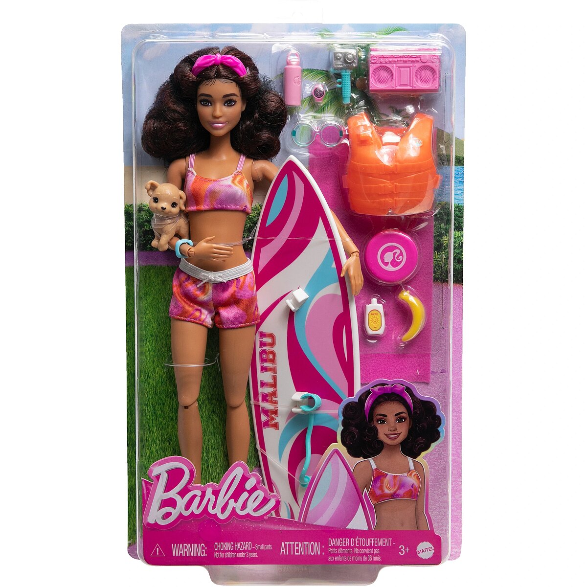 LongDesc - Catch the perfect wave with Barbie! Barbie surf doll is ready for a day of saltwater and sunshine in Malibu with a colourful surf board. The poseable fashion doll wears a swim-casual outfit and comes with a towel, pet puppy, and beach-themed accessories. Kids can collect all the Barbie surf dolls for oceanside adventures! Each sold separately, subject to availability. Dolls cannot stand alone. Colours and decorations may vary.