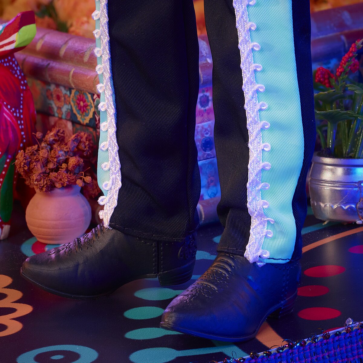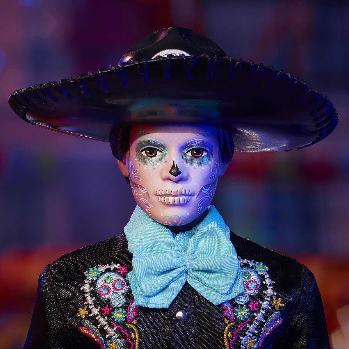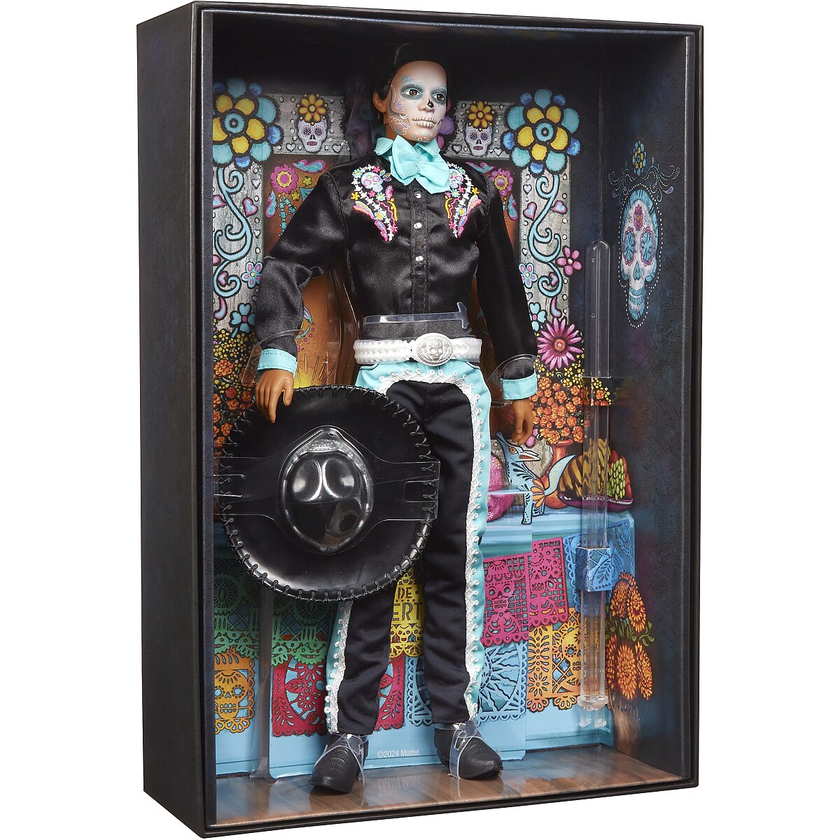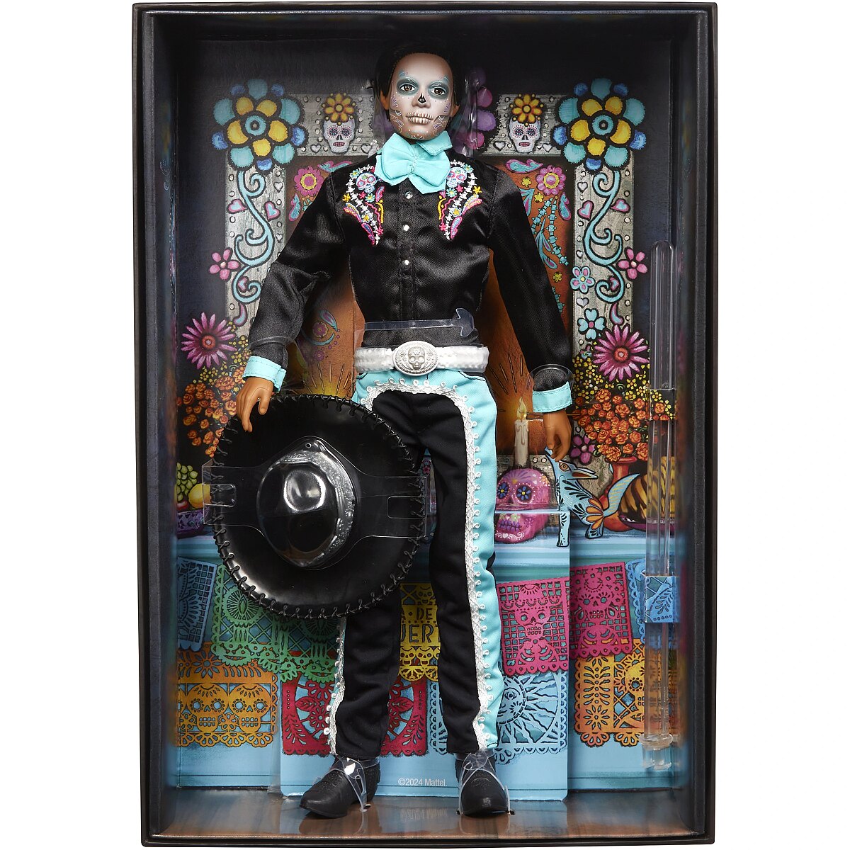 LongDesc - The Barbie Día De Muertos series honors the customs, symbols and rituals often seen throughout this festive time of remembrance. Ken doll cuts a striking figure in a satiny black shirt and pants with sky-blue colour blocking and premium details. A glossy sombrero, detailed belt and calavera face paint enhance his distinguished look. May the 2024 Día De Muertos Ken doll become a treasured keepsake and holiday tradition! Includes doll stand and Certificate of Authenticity. Doll cannot stand alone. Colours and decorations may vary.