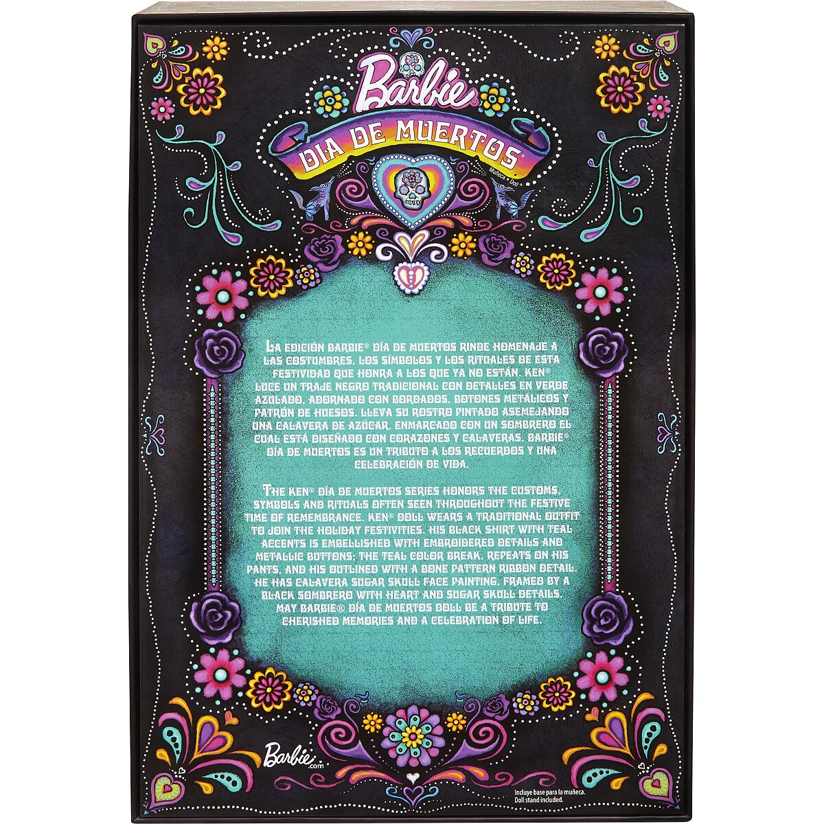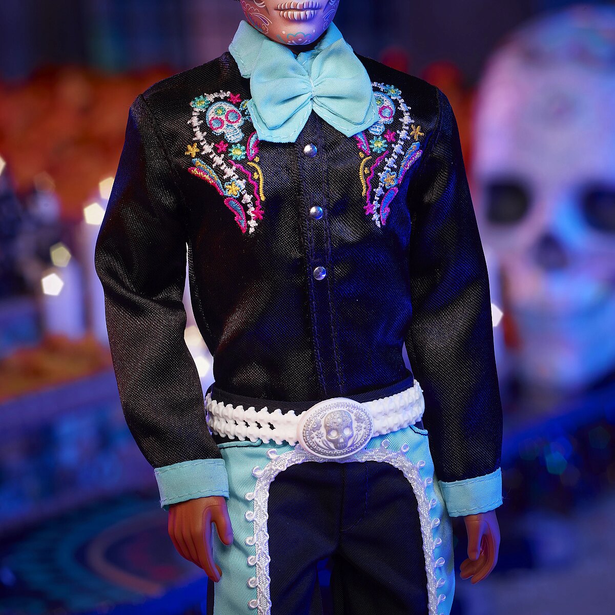 Description - Barbie Signature Día De Muertos 2024 Collectible Ken Doll The Barbie Día De Muertos series honors the customs, symbols and rituals often seen throughout this festive time of remembrance. Ken doll cuts a striking figure in a satiny black shirt and pants with sky-blue color blocking and premium details. A glossy sombrero, detailed belt and calavera face paint enhance his distinguished look. May the 2024 Día De Muertos Ken doll become a treasured keepsake and holiday tradition! Includes doll stand and Certificate of Authenticity. Doll cannot stand alone. Colors and decorations may vary. Barbie continues its Día De Muertos series in 2024 with a sophisticated Ken doll. He wears a deluxe suit infused with references to the traditions, symbols, and rituals of this time-honored holiday. Ken dolls satiny black look features sky blue accent fabric at the collar, cuffs, and pants. White ribbon trim along the pants elegantly mimics bone. Vibrant embroidery of flowers, bones, and sugar skulls adds an additional splash of color to his tailored button down. A glossy black sombrero accentuates his blue-toned calavera face paint, while a sugar skull belt and matching shoes complement his festive look. The 2024 Barbie Día De Muertos doll comes in gorgeously illustrated packaging that is perfect for display and gifting. May he bring joy to your household as you celebrate the memories of loved ones!