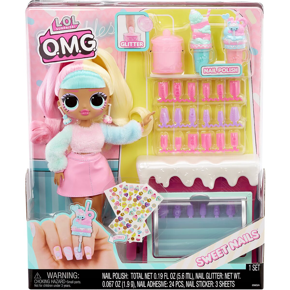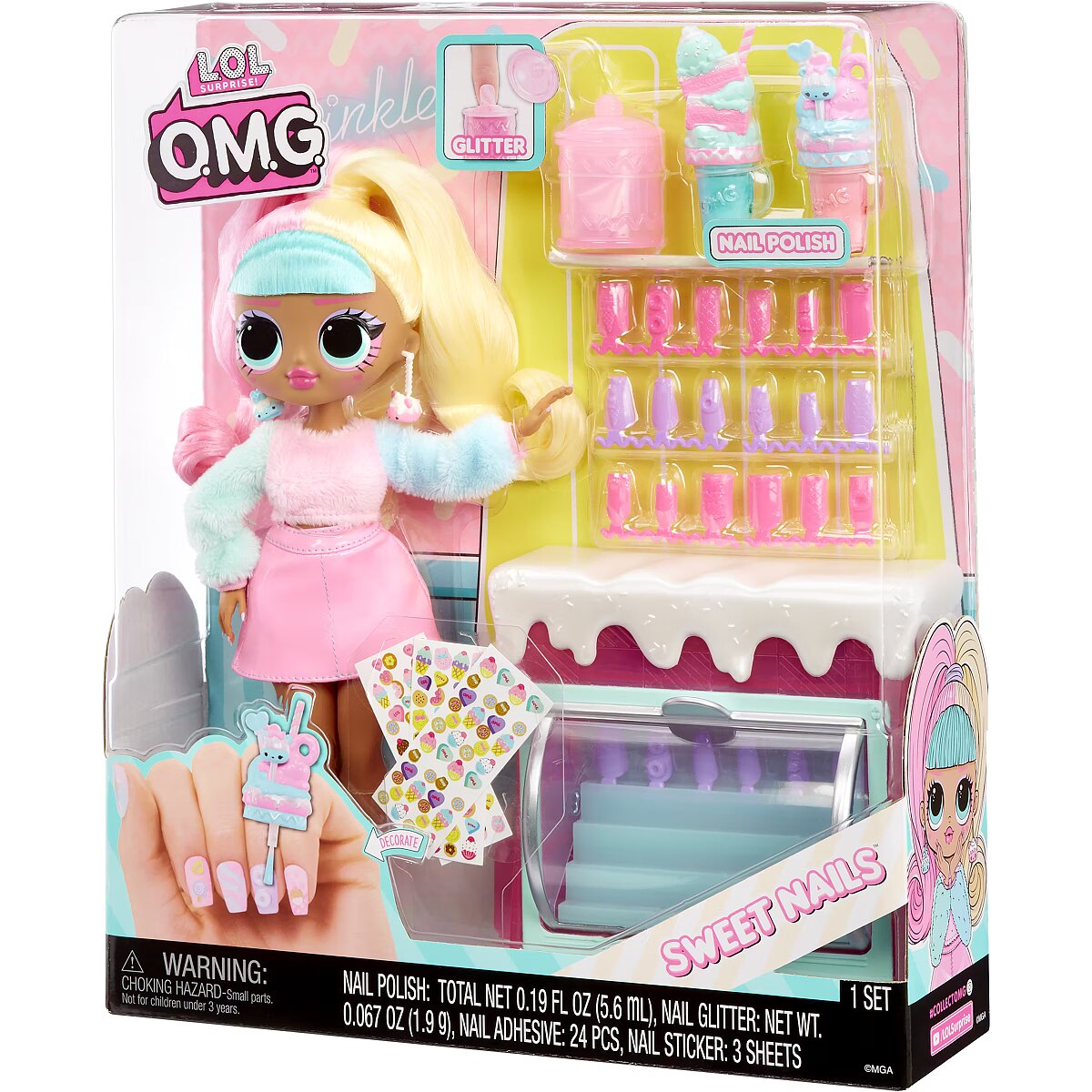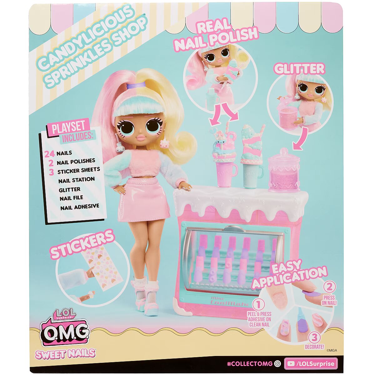 LongDesc - Discover the sweetest surprises with L.O.L. Surprise! O.M.G. Sweet Nails™ – Candylicious Sprinkles Shop™ including an ice cream pop freezer, unique nail accessories, and fan-favorite character, Candylicious, styled in her signature pastel colors and gorgeous hair! Help run the fabulous Candylicious Sprinkle Shop™ and unbox amazing surprises inside, where you can make your own popsicles and serve beautiful milkshakes! First, open up the ice cream pop freezer and reveal 24 pretty, pastel nails that look like popsicles and can be placed on UR own nails and decorated! Look closely at the nails to explore cute dessert-themed details including ice cream cones, doughnuts, and more! Then, discover 2 outrageously fun milkshakes, and open up the bottles to reveal two trendy nail polish colors to apply on the nails! Check out the sweet, pink candy jar and open it up to reveal REAL nail glitter! Now you are all set to get creative and customize your own nails – peel and press the nail adhesives, press on a set of nails, use the nail file to shape your nails, paint them, then finish off your designs with glamorous glitter and dessert-themed stickers for more sweet, styling fun! When designing your nails, don’t forget to place your fingers on the finger grooves on the top of the nail station for greater stability! The pop freezer also serves as a nail display case to store and showcase your delightful popsicle treats when finished! This adorable dessert shop has the sweetest surprises ever with realistic styling to help spark your imagination when running the Candylicious Sprinkles Shop™ with the gorgeous Candylicious Fashion Doll and her fabulous fashions and accessories. Candylicious has stunning features, stylish hair, and is articulated with tons of poses. Pro Tip: Hands are removable for easy dressing. Collect all 3 unique Sweet Nails™ Shops: Kitty K Café™, Pinky Pops Fruit Shop™, and Candylicious Sprinkles Shop™ and create dozens of designs! L.O.L. Surprise fashion dolls with stylish hair, outfits and many detailed accessory pieces make a perfect toy for kids, including 4 years old and up for imaginative pretend play! As gifts for any special occasion, dolls provide hours of social play with siblings and friends! From MGA Entertainment, creators of L.O.L. Surprise fashion and collectible dolls, Rainbow High™ fashion dolls, Na Na Na Surprise dolls, Bratz® fashion dolls, MGA's Dream Ella™, MGA's Glitter Babyz™, Lalaloopsy™, Baby Born® Surprise baby dolls and collectibles, Little Tikes® kids' toys and many other favorite brands.