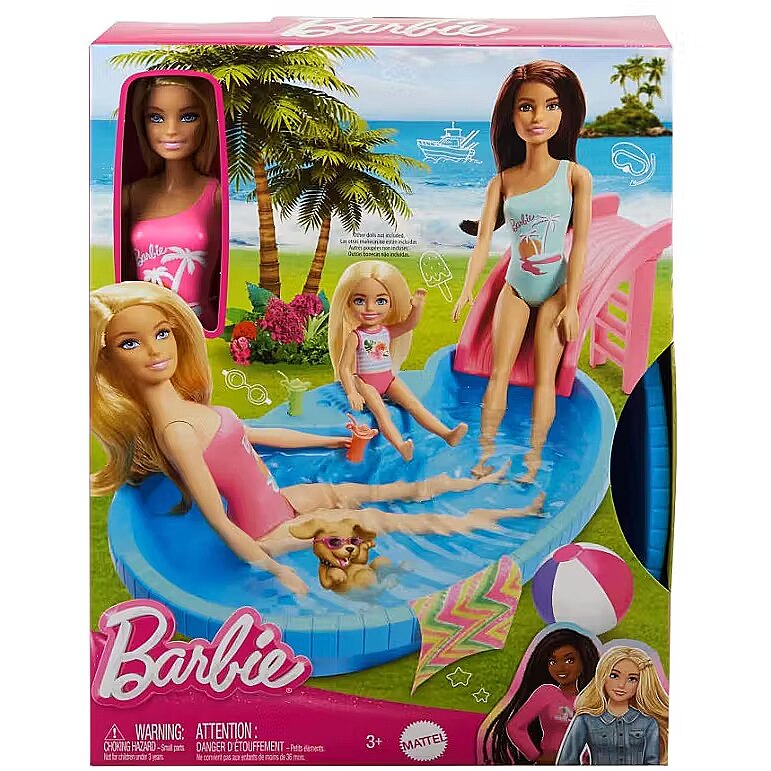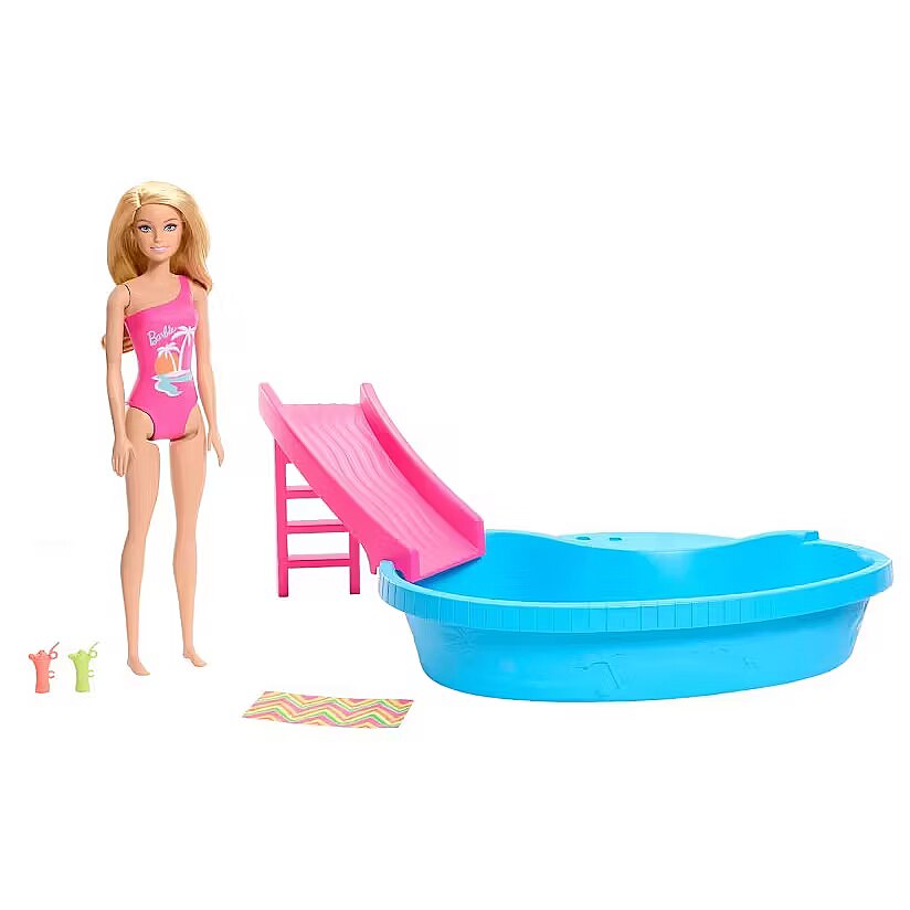 Description - Slide into summer fun with Barbie doll and her pool! It's easy to fill and empty for an instant pool party. Help Barbie climb the ladder and go down the slide, then relax in the water with a refreshing drink! With a cute and colorful aesthetic that will make a splash at playtime, this doll and pool set is a perfect gift for kids 3 years old and up. Barbie doll cannot swim or stand alone. Colors and decorations may vary. Play out fun in the sun! Barbie doll comes with everything she could need for a perfect summer afternoon: a pool, slide, and accessories. Kids can easily fill the pool with water, making playtime extra fun and engaging. Push Barbie down the slide and watch her splash into the pool! Colorful accessories like a towel and two drinks enhance storytelling even more. From a relaxing afternoon to a pool party with friends, there are so many tales to tell! Barbie doll is dressed for poolside lounging in a pink one-piece swimsuit with a tropical sunset design. Kids can collect other Barbie dolls and playsets to build out their Barbie world and expand playtime possibilities! Each sold separately, subject to availability.