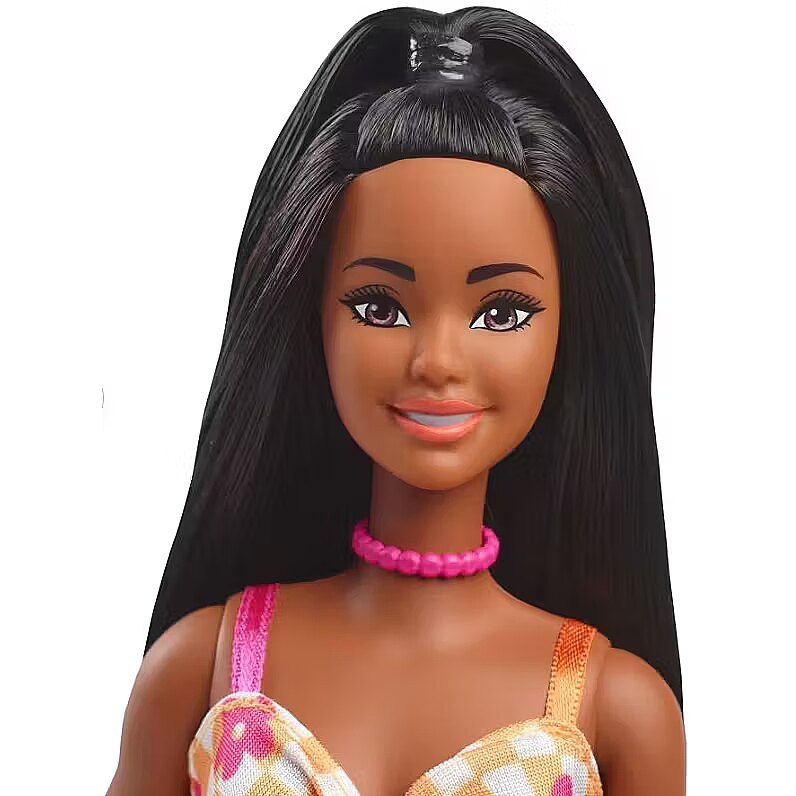 Description - Barbie Fashionistas dolls celebrate diversity and offer endless possibilities for storytelling and fashion exploration. With this inclusive collection, kids can see how fun it is to express personality through style! Barbie Fashionistas are an ideal gift for fashion-loving kids everywhere. Each sold separately, subject to availability. Dolls cannot stand alone. Colors and decorations may vary. Designed to reflect the world kids see today, this diverse line of Barbie Fashionistas dolls showcases bright and trendy styles that inspire endless storytelling possibilities. This tall Barbie doll wears her black hair half up, half down! Her look features fun details that make her personality pop, like a pink choker necklace and orange platform sandals. She radiates sunshine in her checkered orange and white midi dress! The pink flower print and twisted bodice cut-out add an extra dose of charm. With such a versatile and stylish look, this Barbie doll is ready for any adventure that kids dream up! Kids 3 years and up can collect other Barbie Fashionistas dolls for even more fun with friends and fashion at playtime!